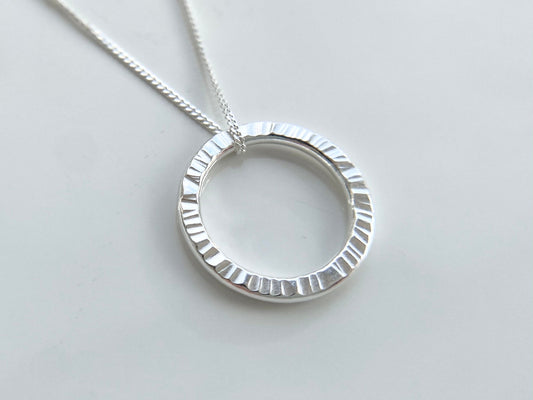 Silver Circle Pendant Necklace with Line Texture