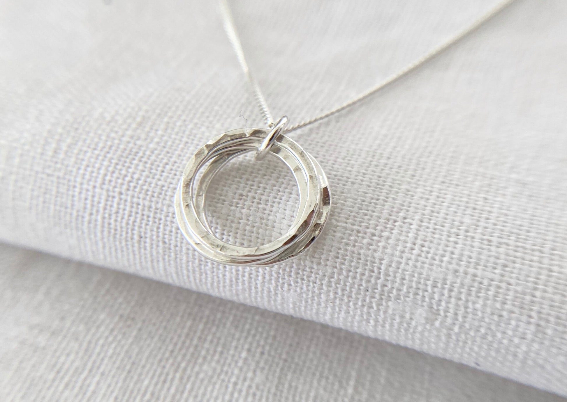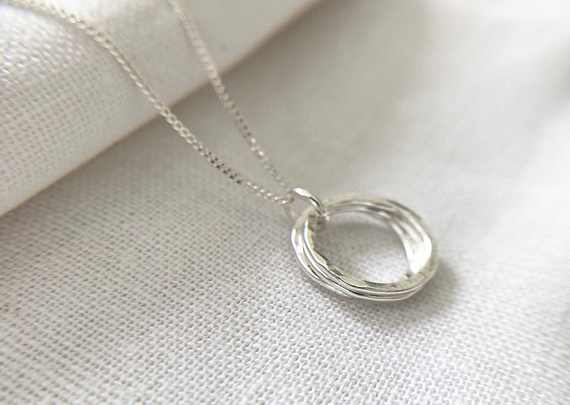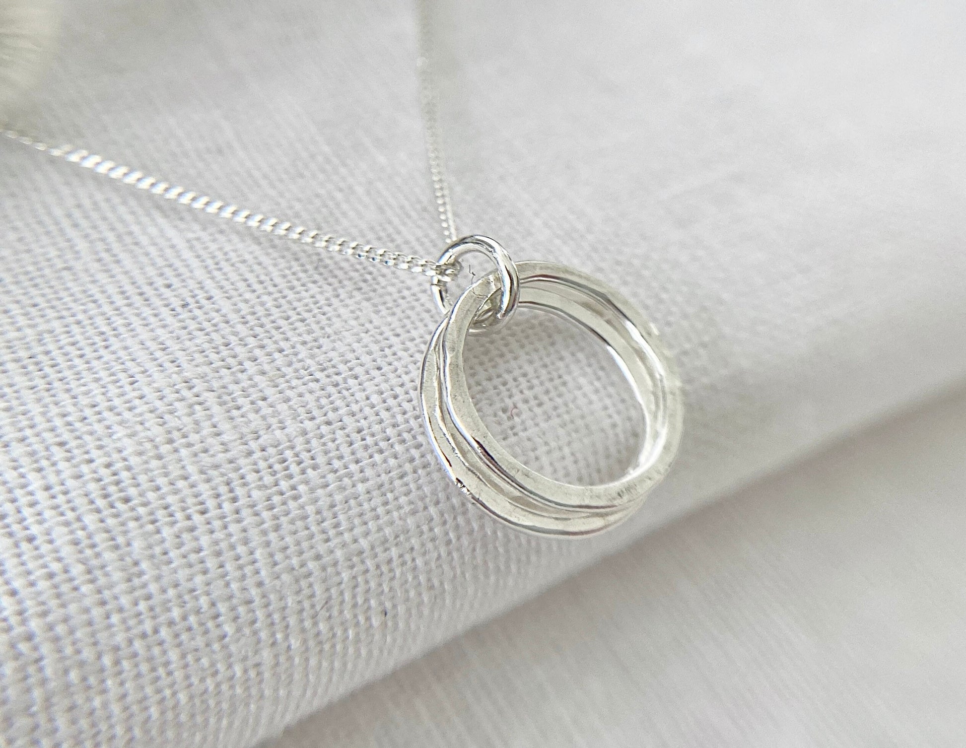 Perfect as a thirtieth birthday gift with meaning, this three ring sterling silver necklace features three petite, lightly hammered rings on a delicate sterling silver chain, to celebrate three decades.