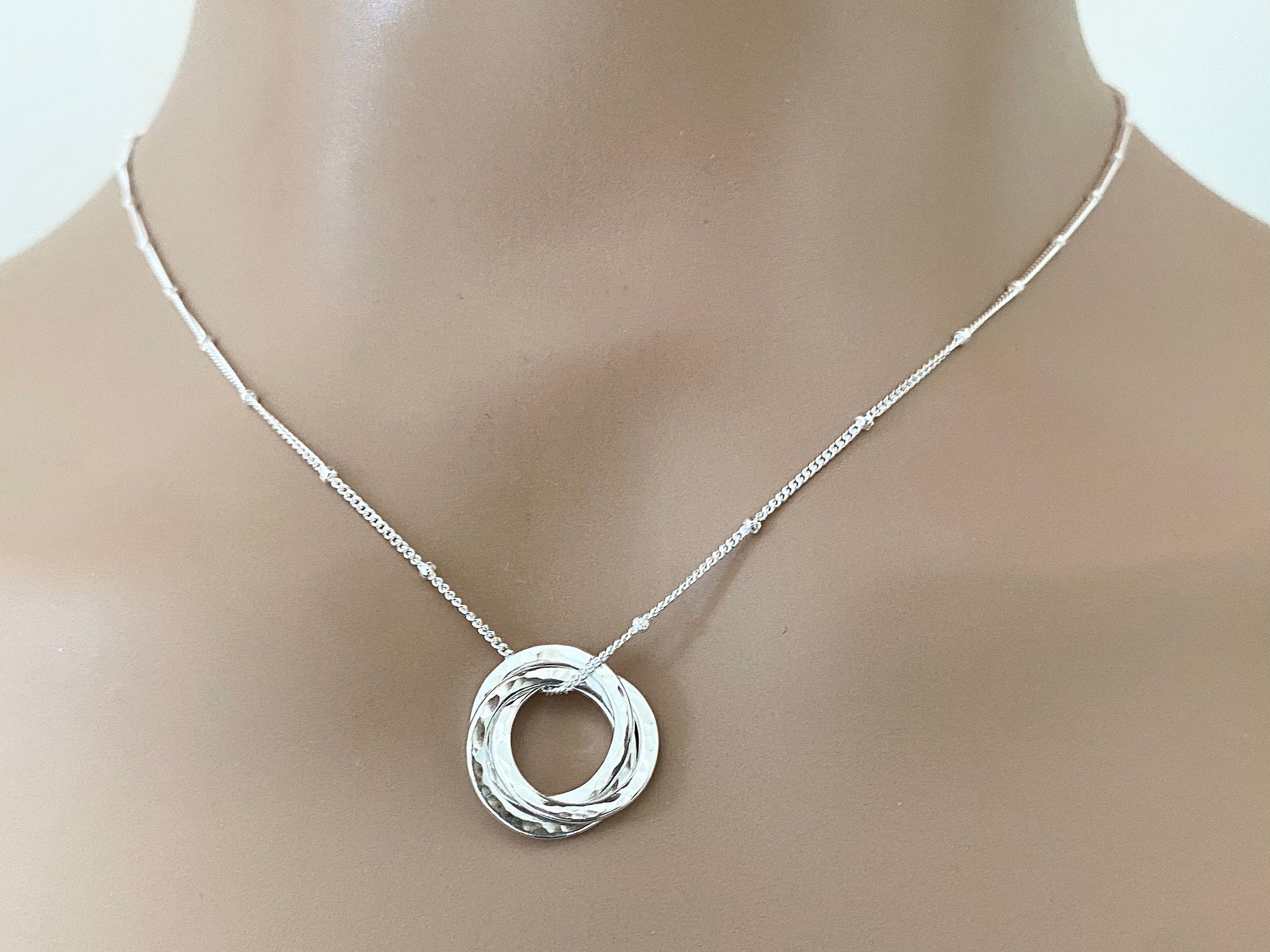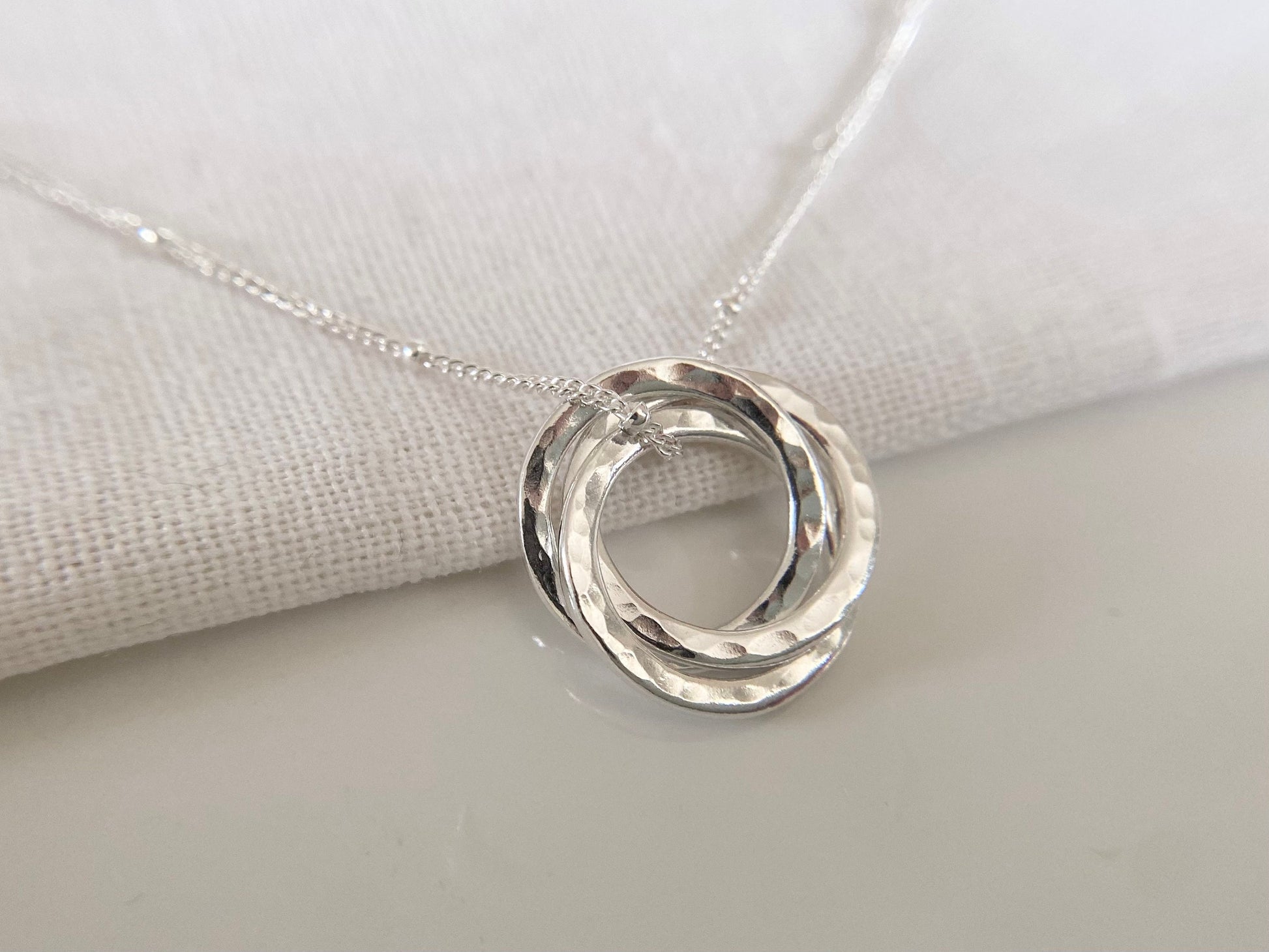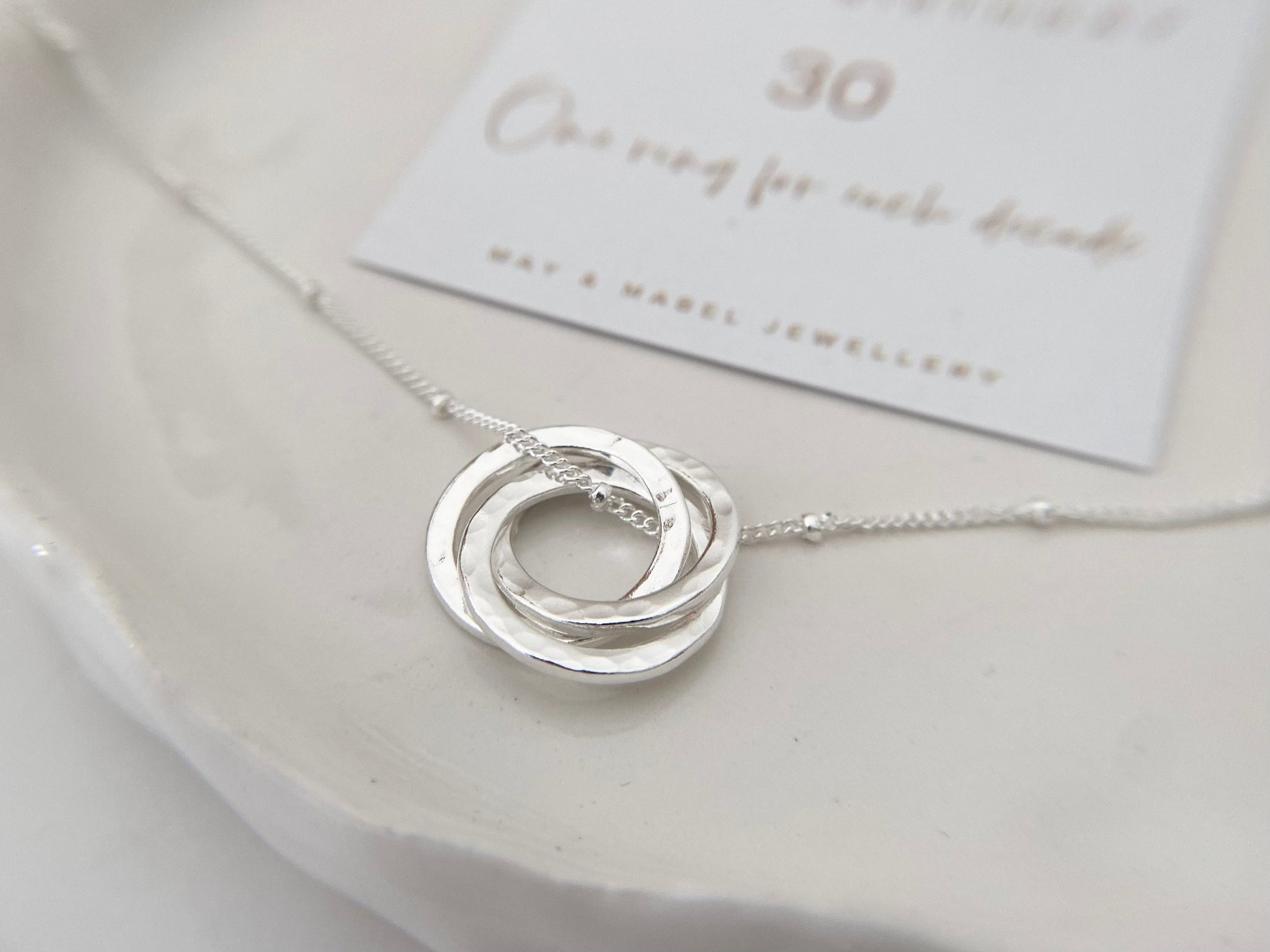 A stunning necklace to treasure for a special 30th birthday, this interlocking three ring necklace features three rings for three decades. Each of the three interlocking sterling silver rings has a uniform hammered finish. The rings sit directly on a delicate sterling silver satellite chain.