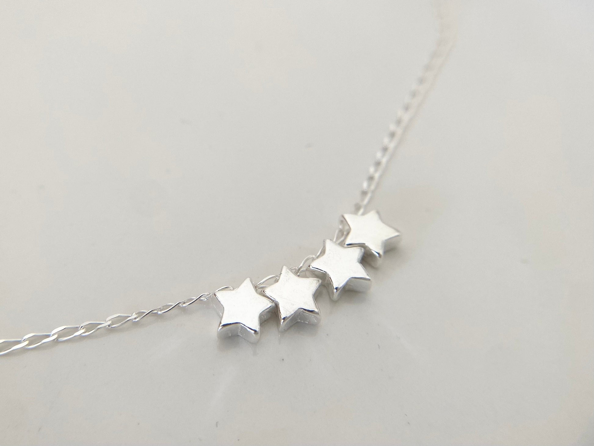 The four silver star beads measure 5mm and are threaded onto a delicate sterling silver diamond cut curb chain.