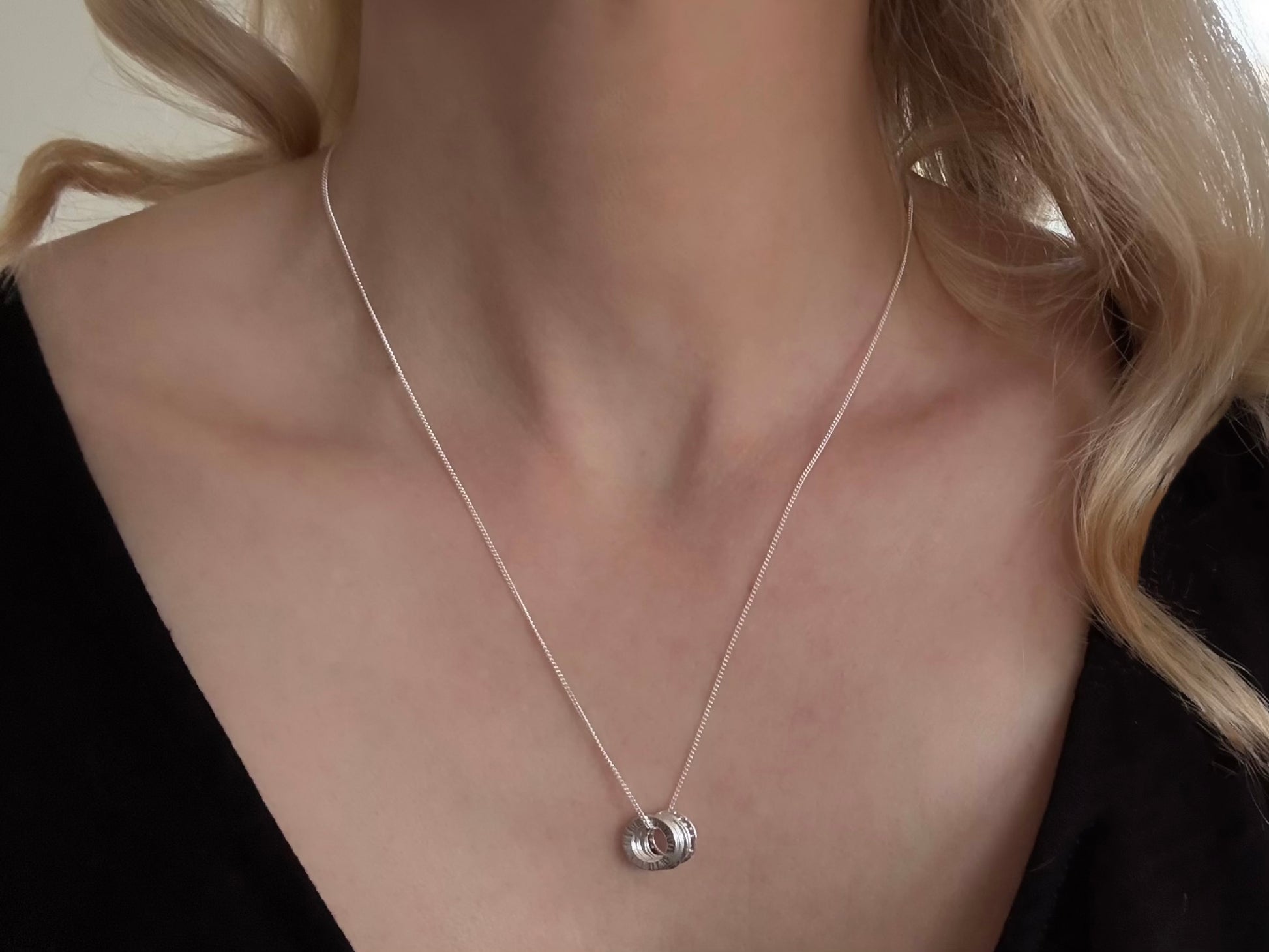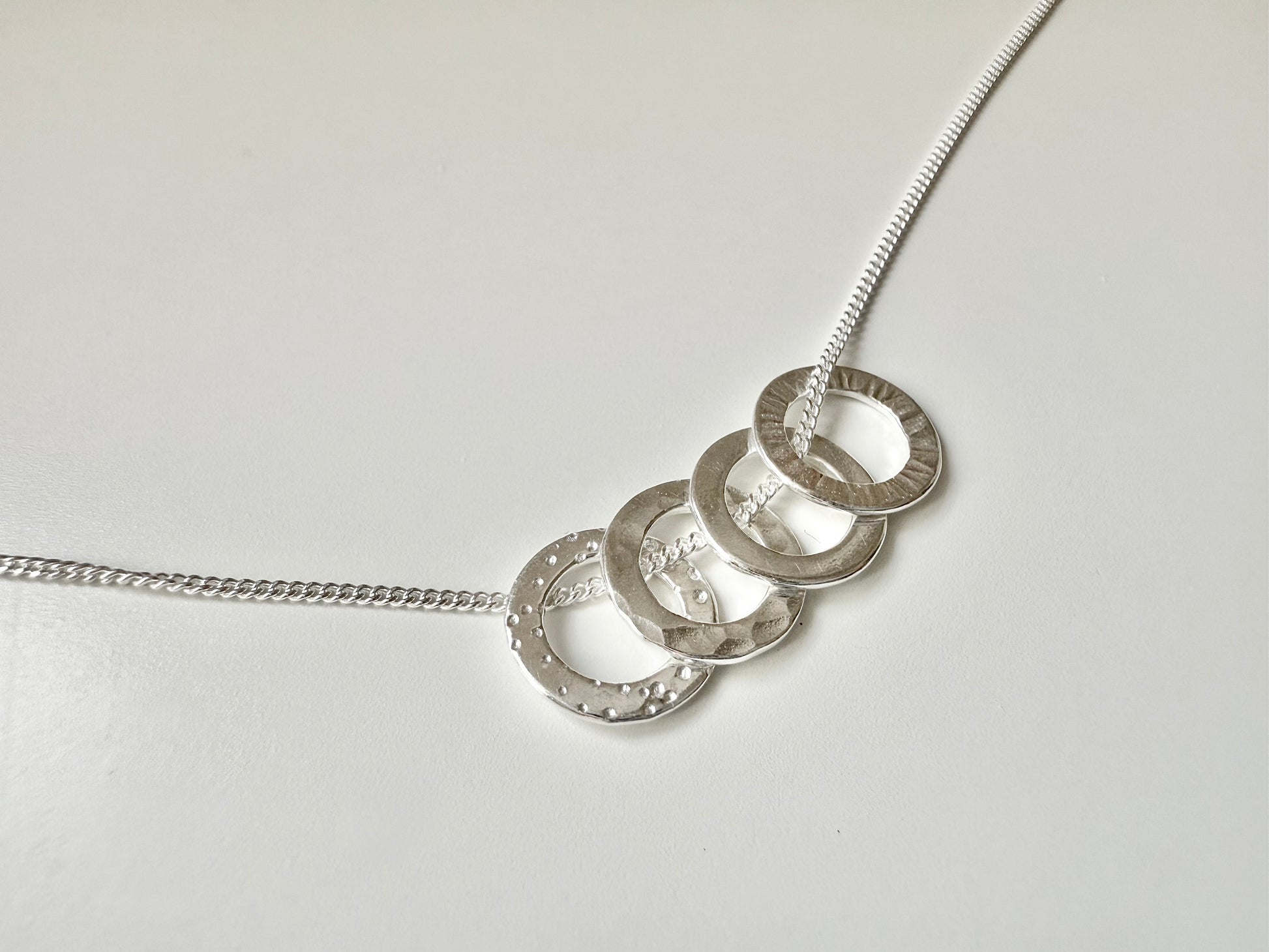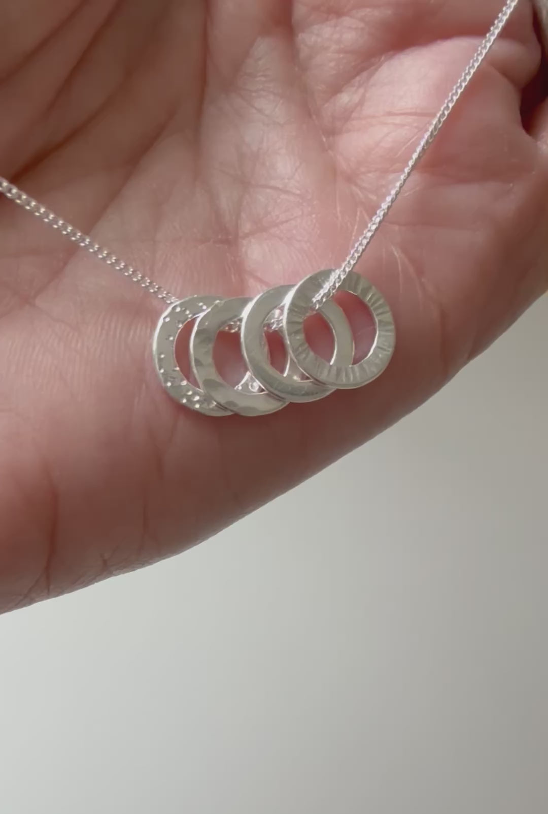 A dainty sterling silver necklace for a special 40th milestone birthday, featuring four small light weight silver rings that move independently along the chain. Each ring measures 10mm and has a unique texture on one side, with a smooth-finish on the reverse side.