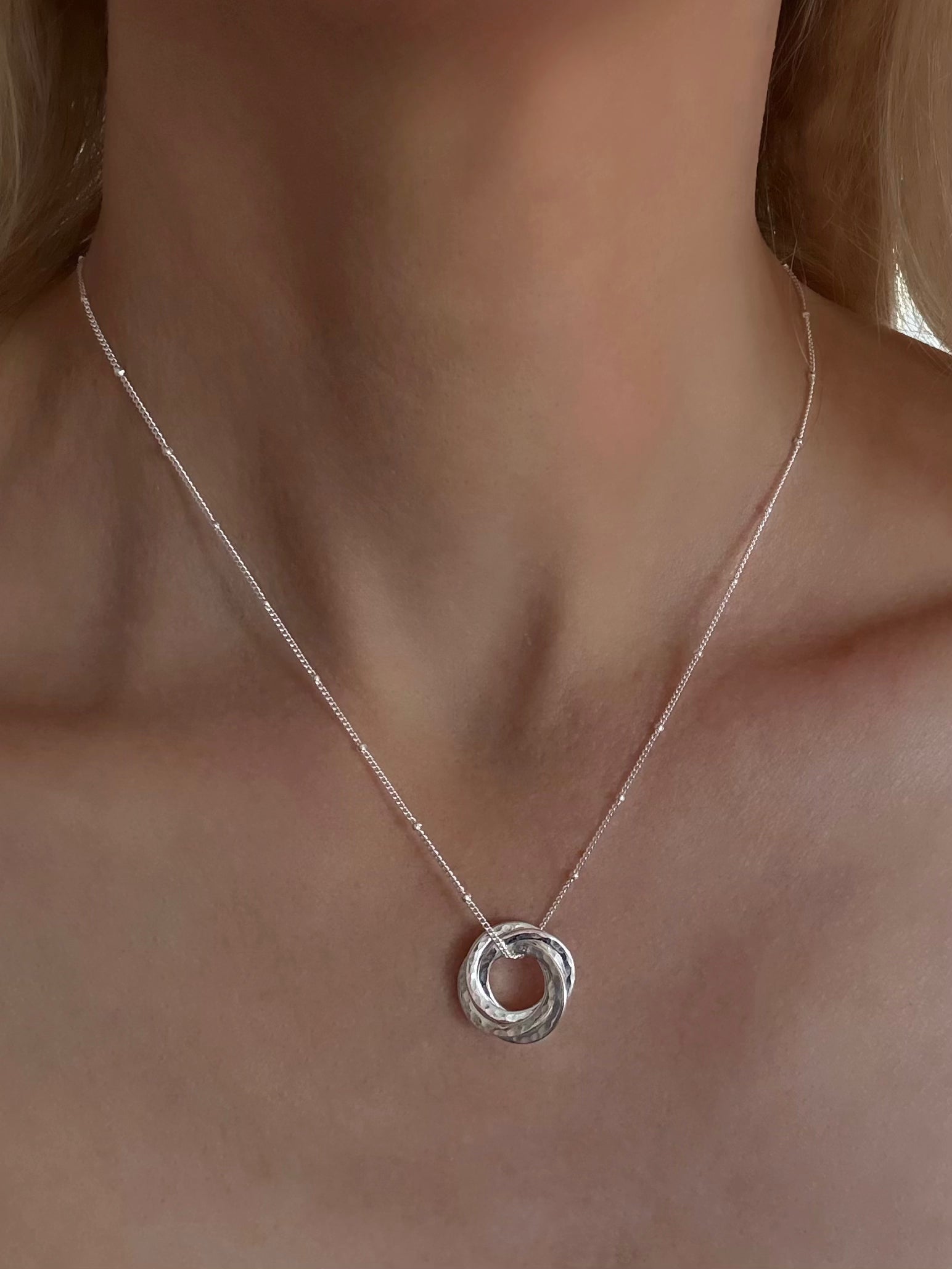 A stunning necklace to treasure for a special 40th birthday, this interlocking four ring necklace features four rings for four decades. Each of the four interlocking sterling silver rings has a uniform hammered finish.