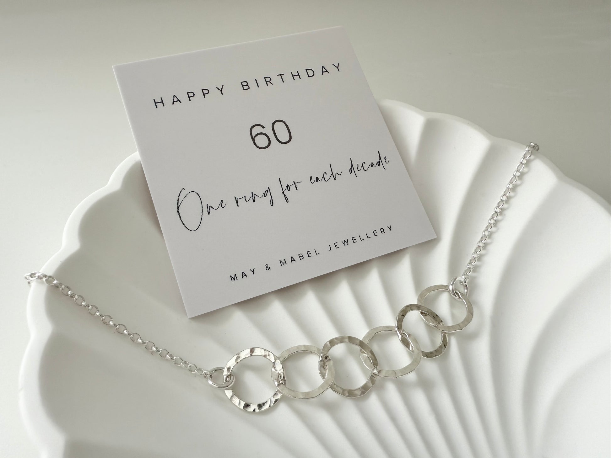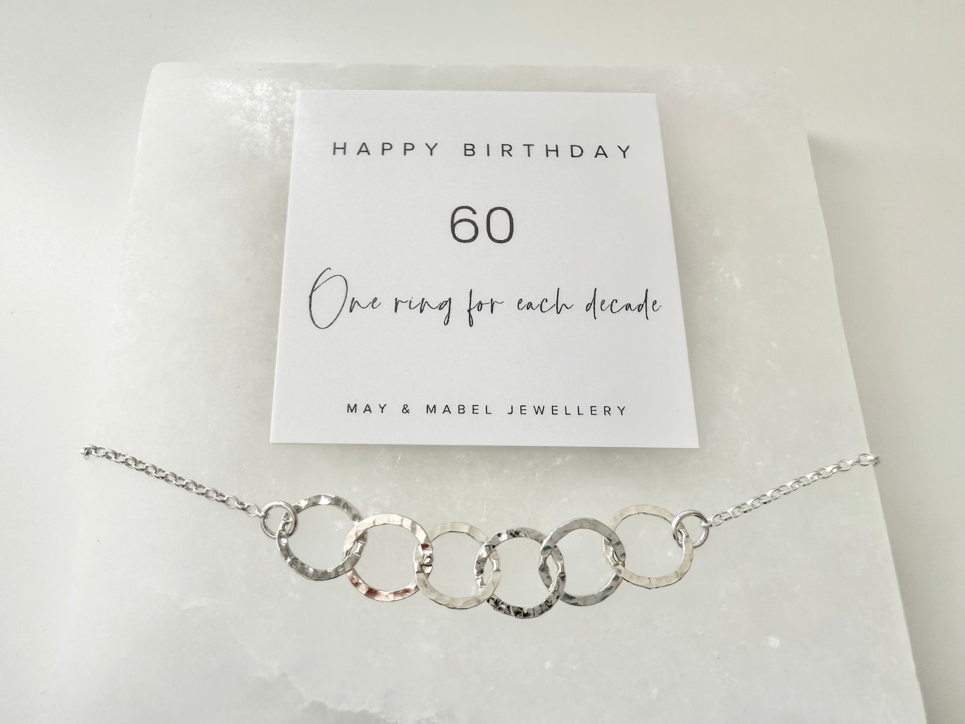 A beautiful 60th birthday gesture, this sterling silver six ring necklace makes the perfect gift to celebrate a special six decades milestone.
