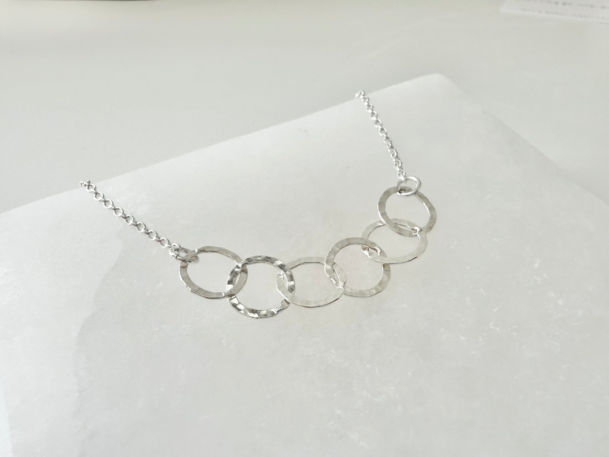 Each sterling silver linked ring has a hammered finish and measures approximately 10mm.