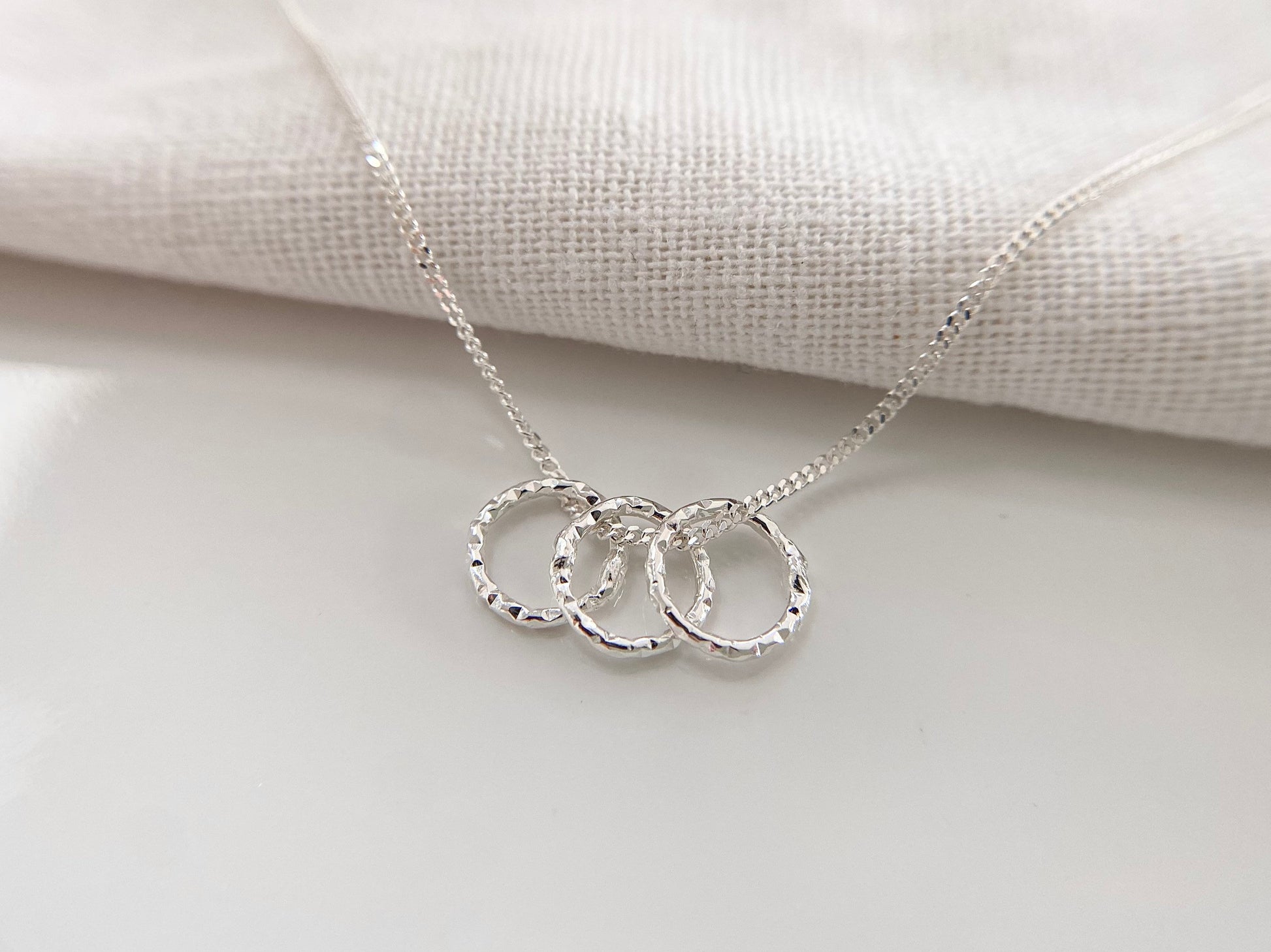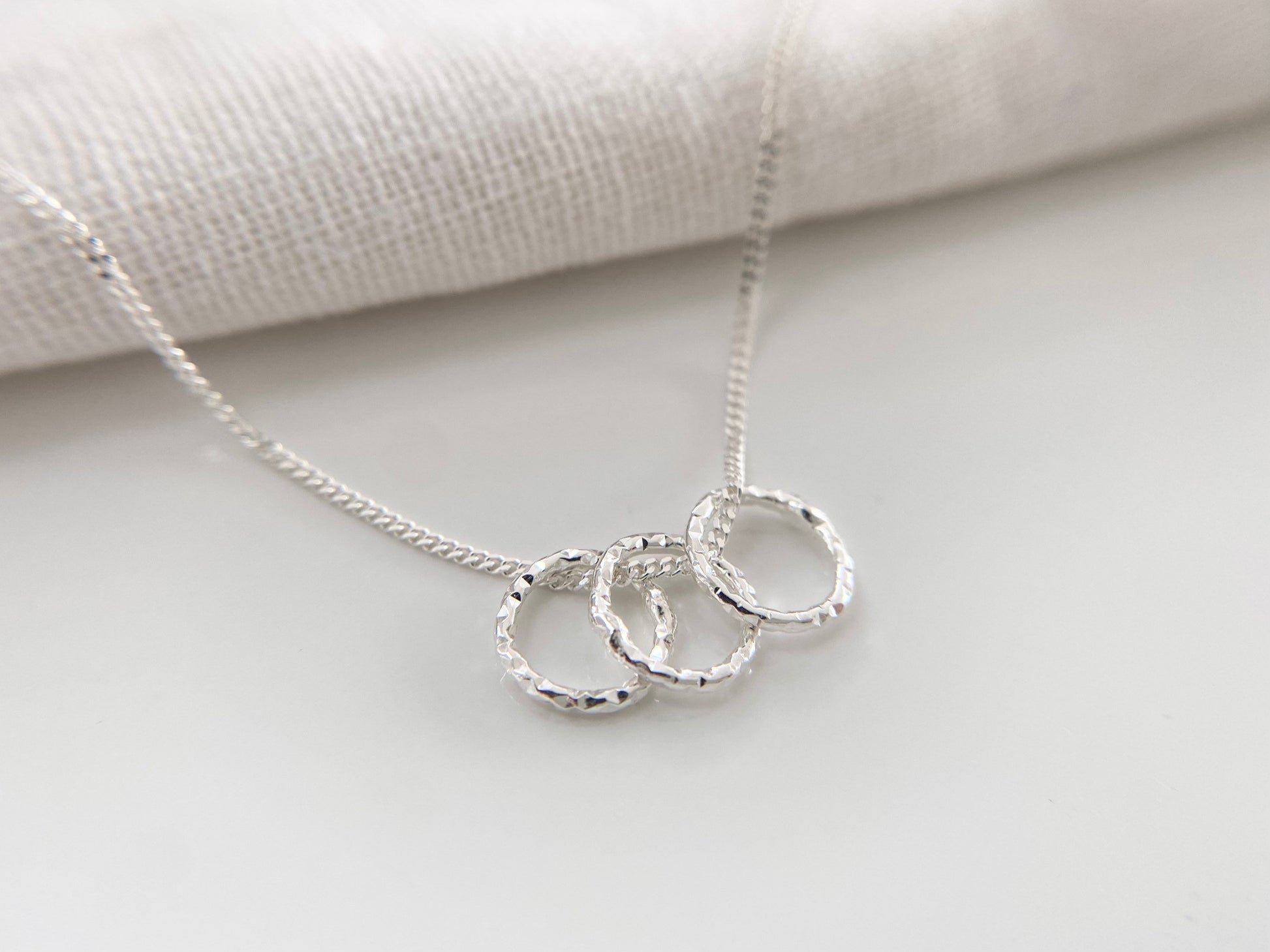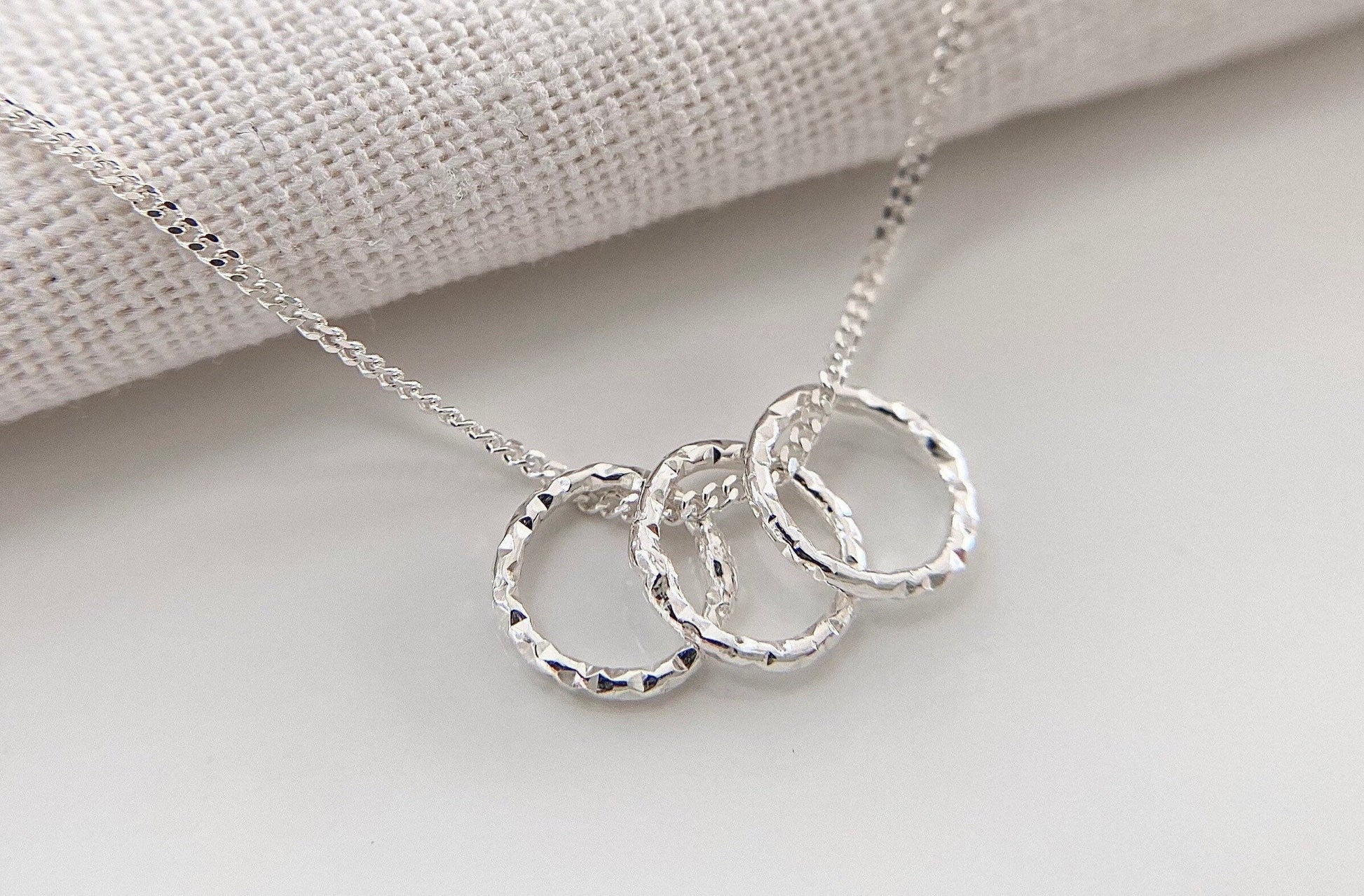 Lovely as a thirtieth birthday gift to represent three rings for three decades, this dainty, lightweight sterling silver necklace features three petite 10mm Sterling silver diamond cut rings on a delicate sterling silver chain.