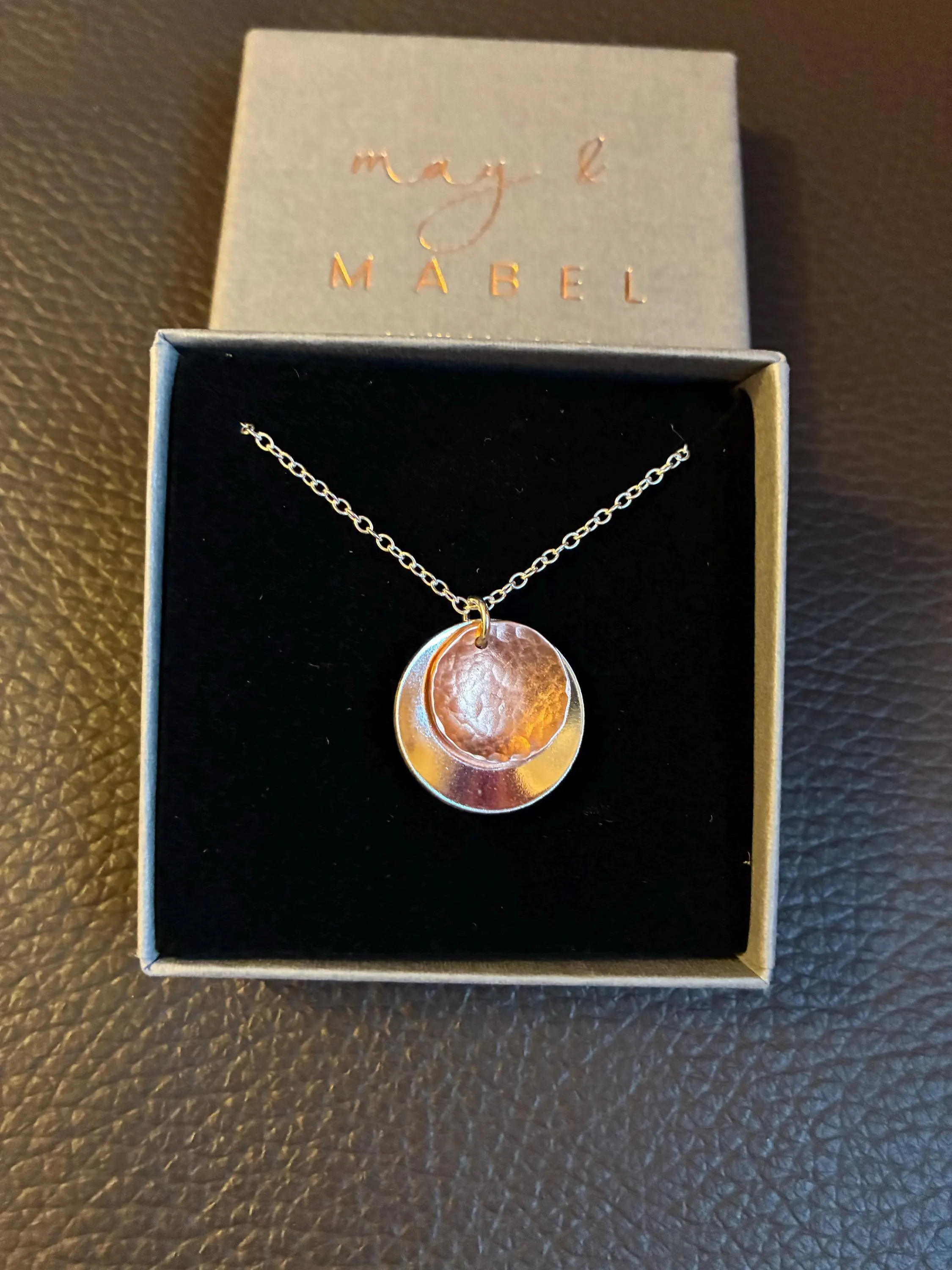 The sterling silver disc measures approximately 17mm. The copper disc measures approximately 13mm. The necklace is available with a 16”, 18” or 20” length chain.