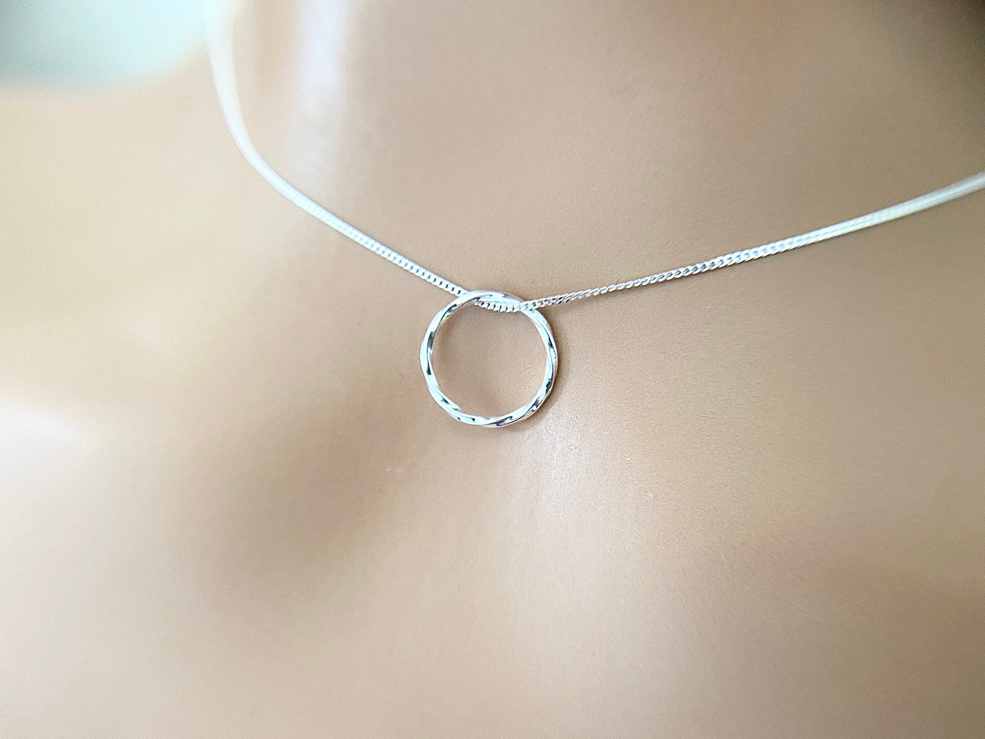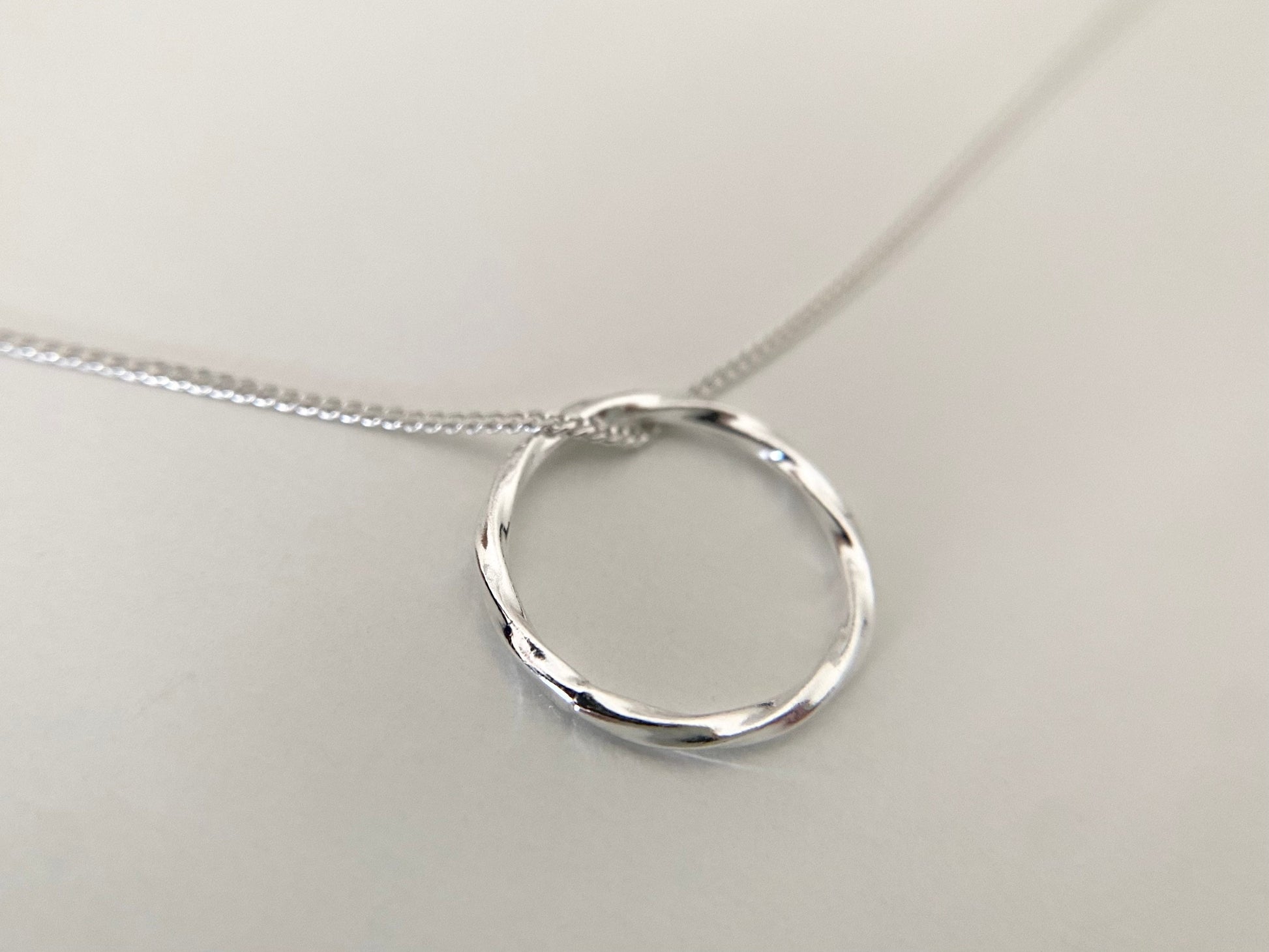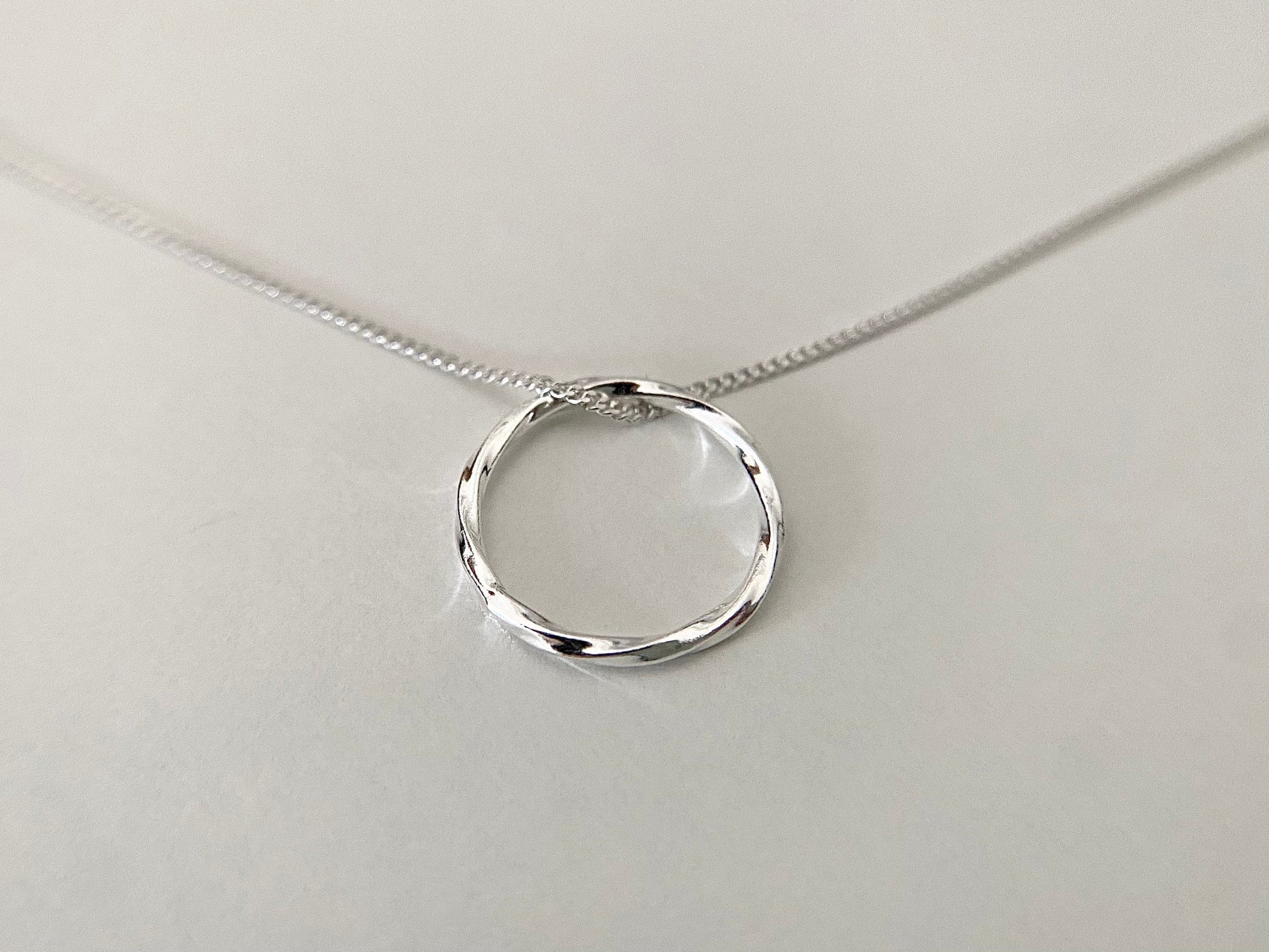 A dainty sterling silver twisted circle pendant necklace. The pendant sits on a delicate sterling silver diamond cut curb chain.