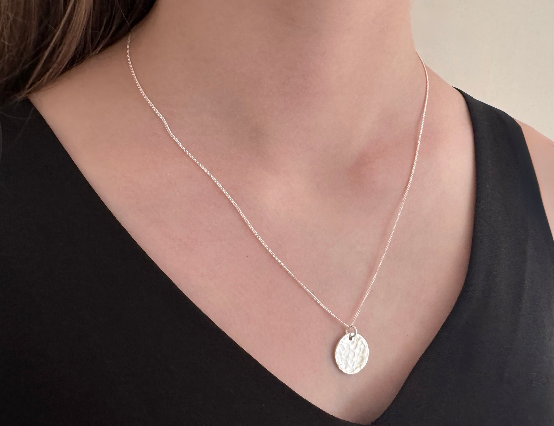 This classic pendant necklace features a shiny, hammered sterling silver disc on a lightweight sterling silver chain.