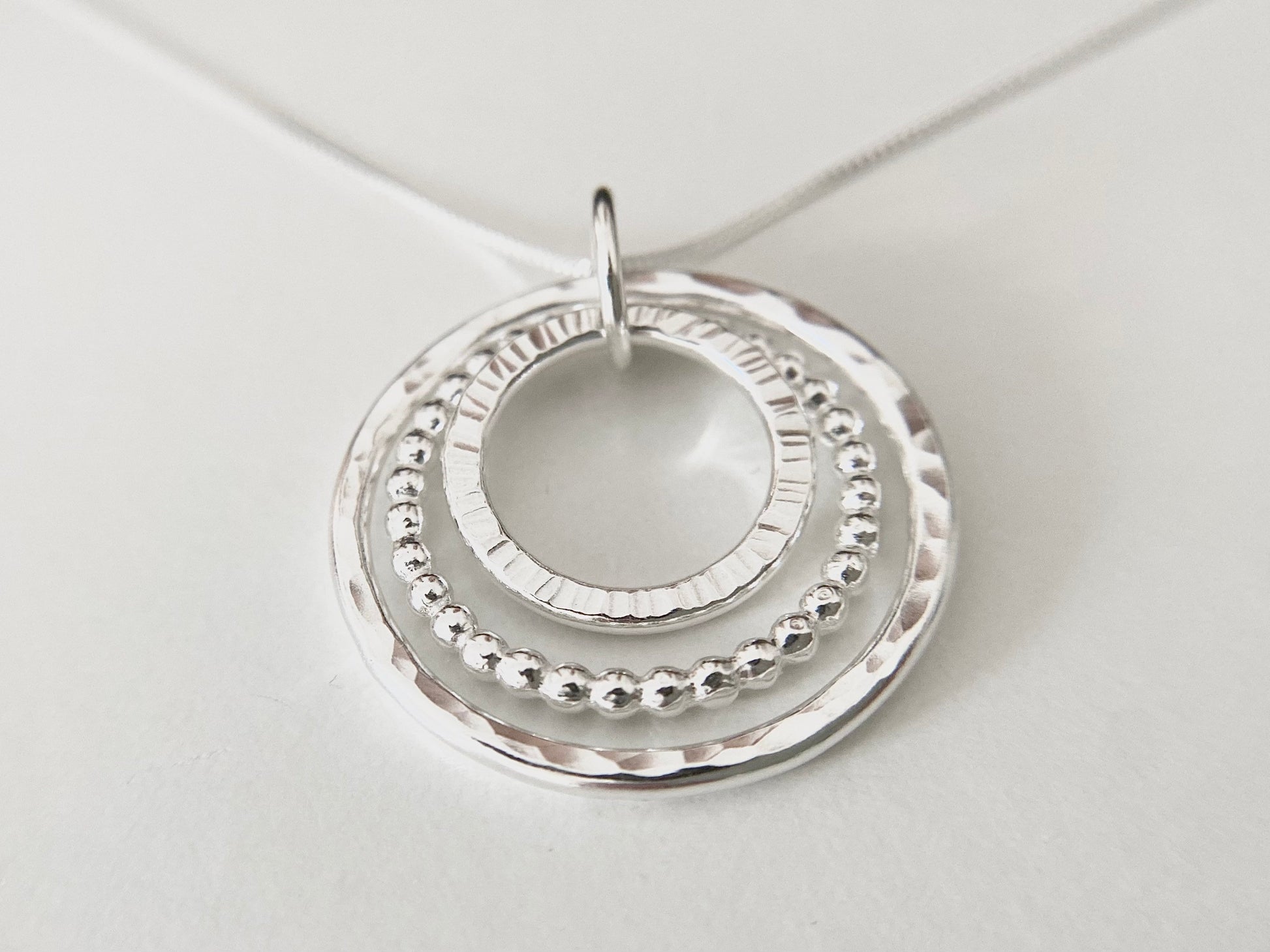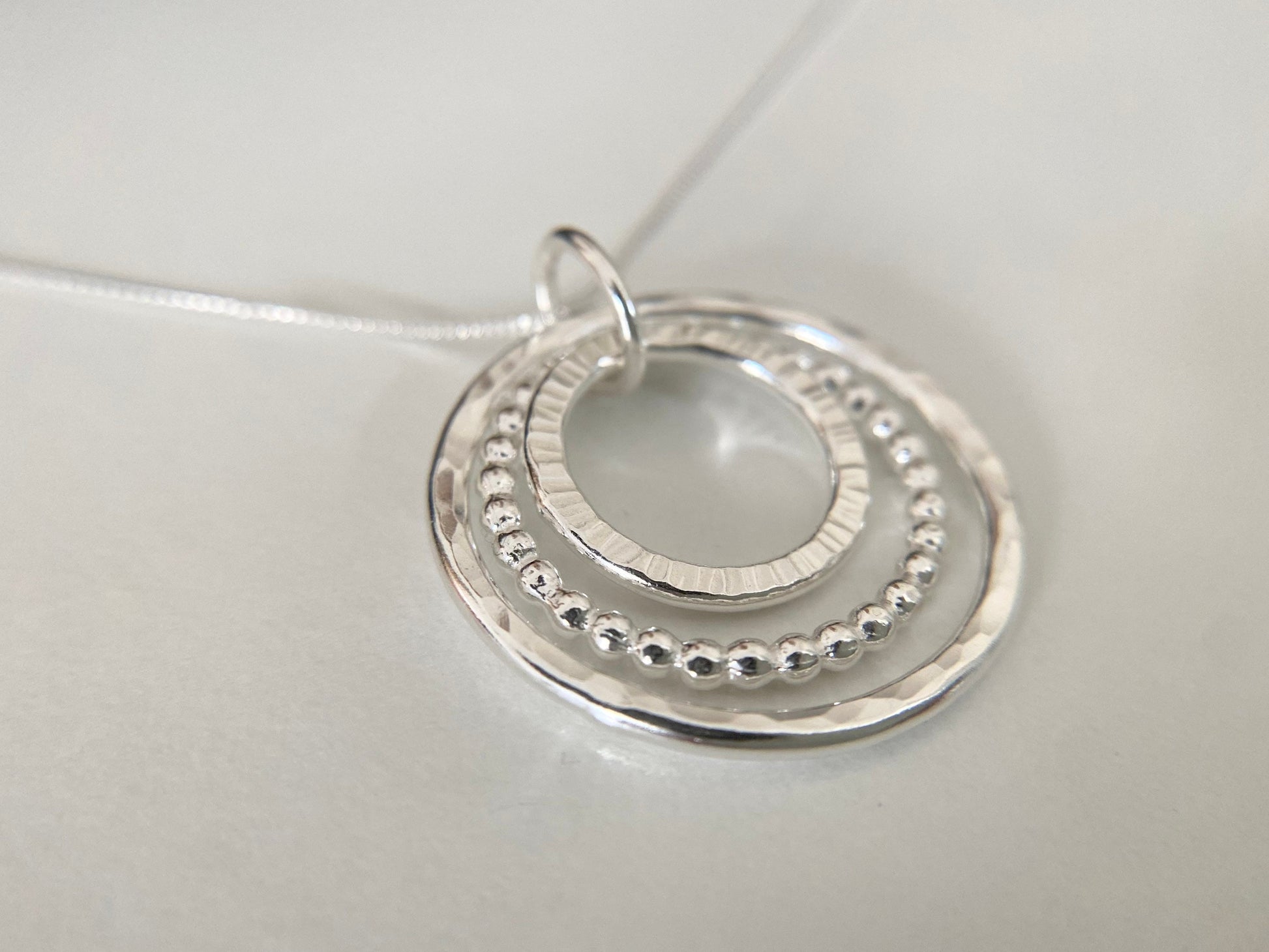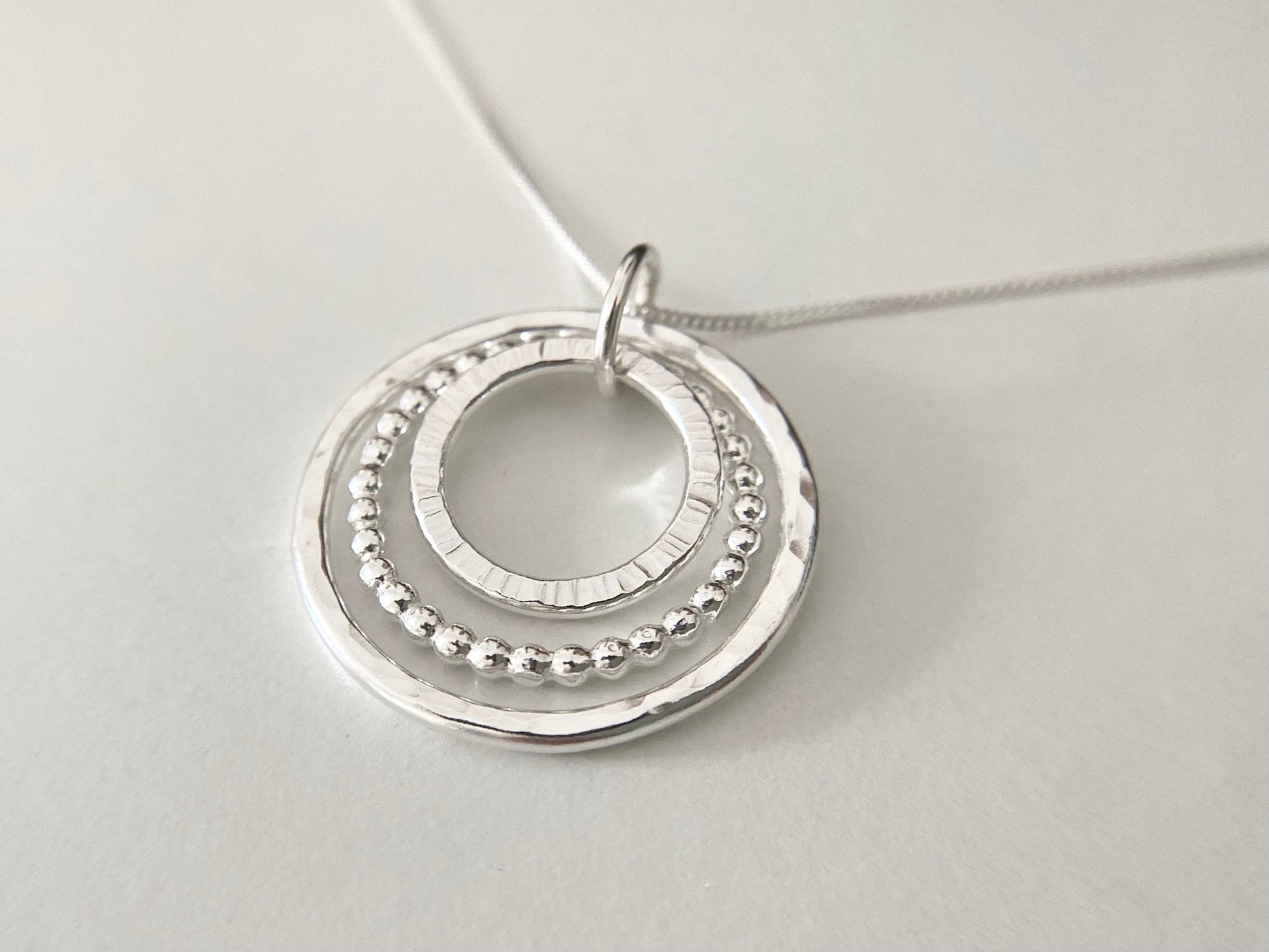 Perfect for a 30th birthday gift in celebration of three decades, this silver necklace has three sterling silver circular rings measuring approximately 15mm, 18mm and 25mm.