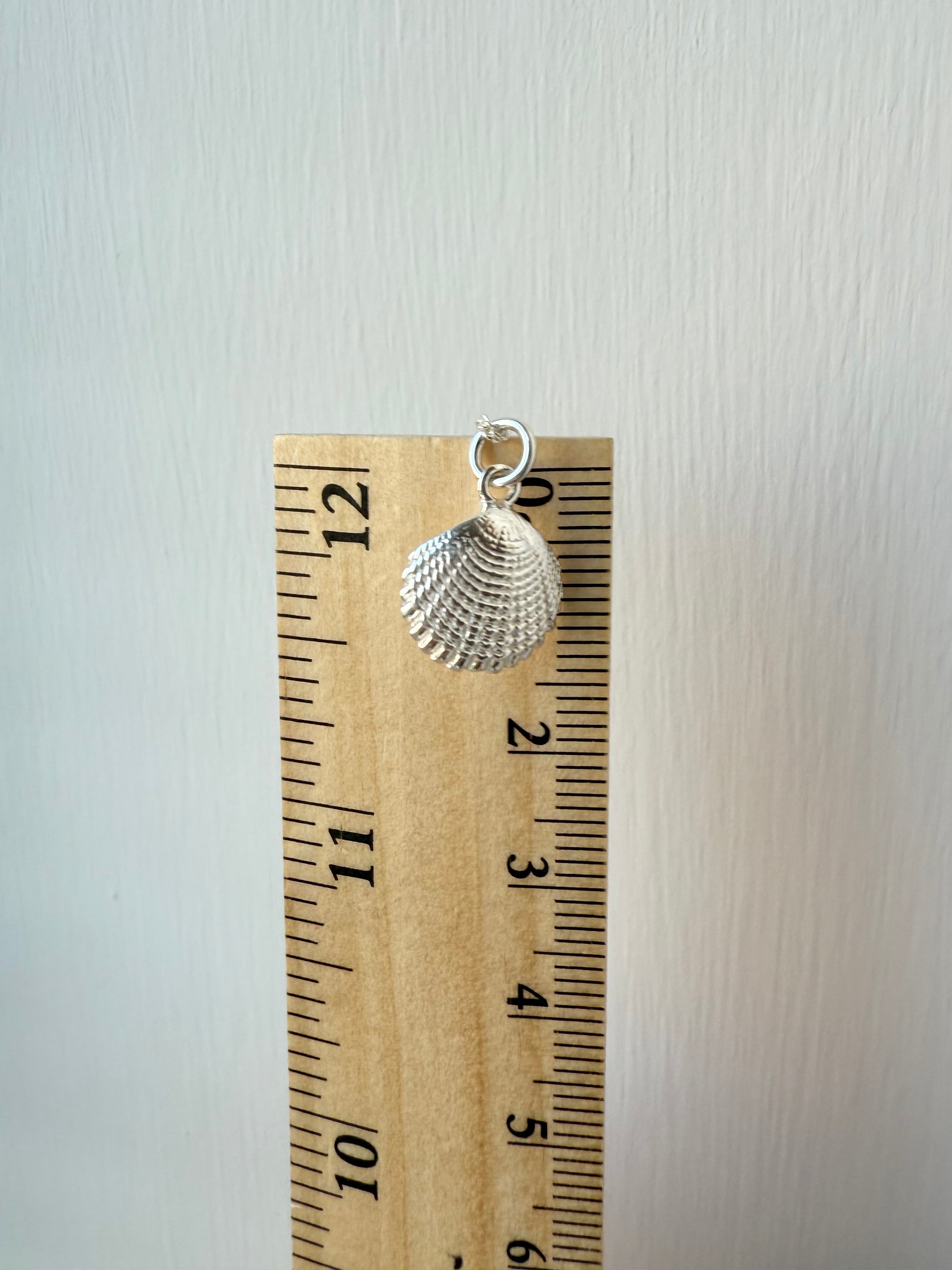 A petite sterling silver shell pendant on a delicate sterling silver diamond cut curb chain.