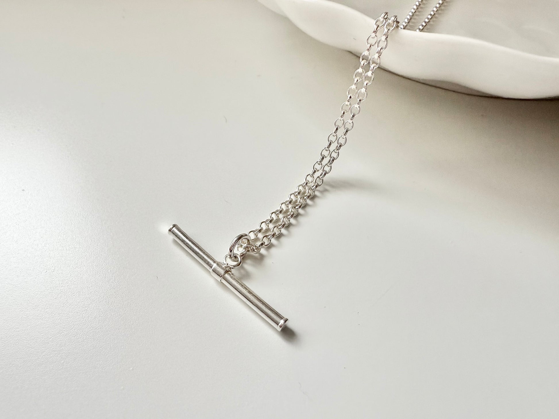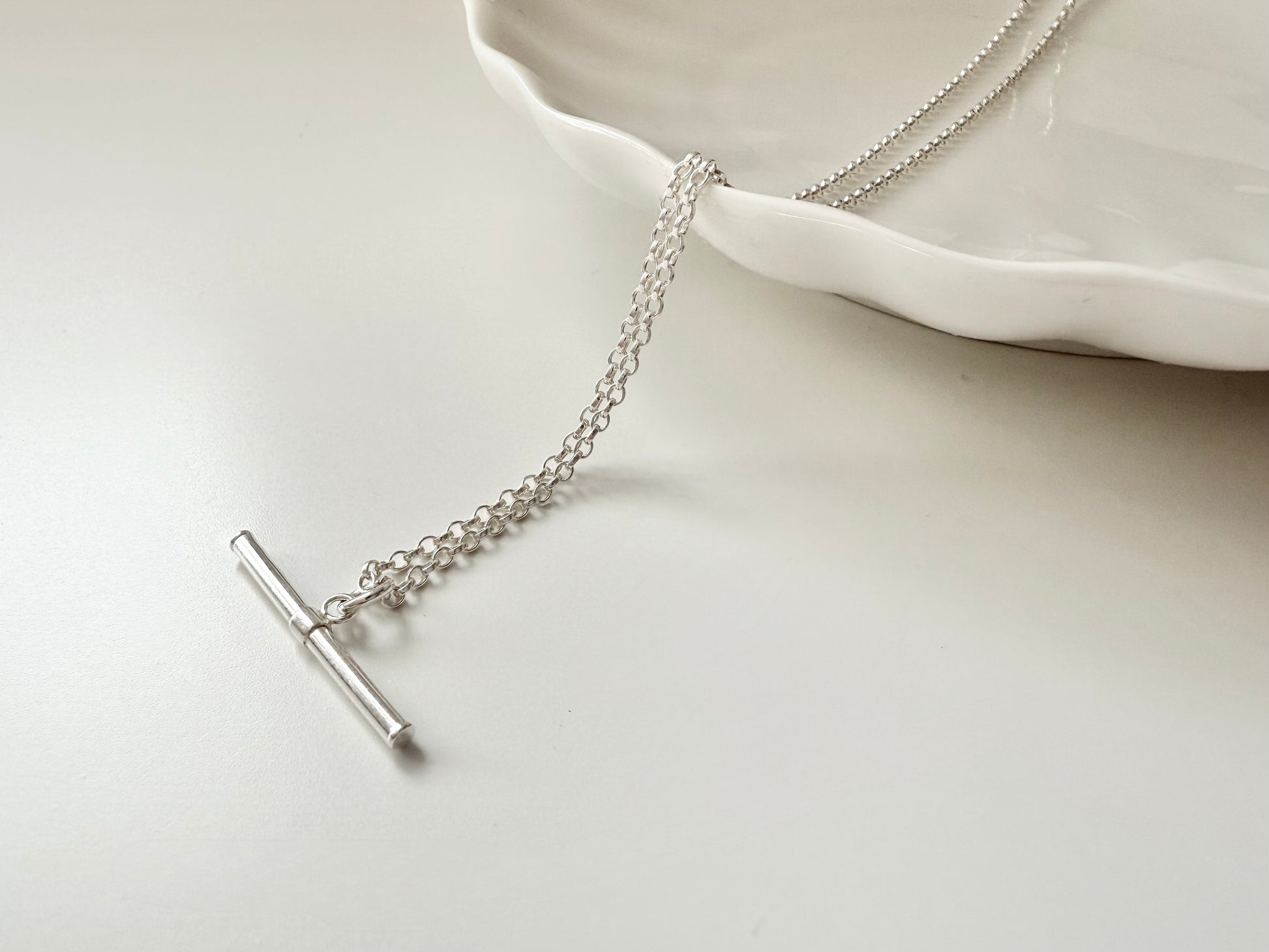 A sterling silver t-bar necklace, on a belcher chain with bolt ring closure. The necklace is suspended on the chain by a connecting ring.