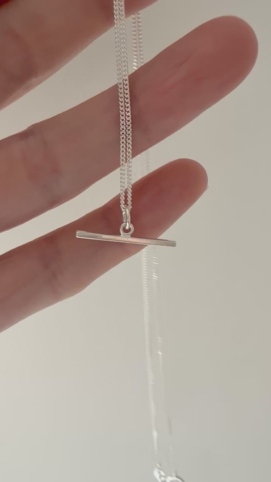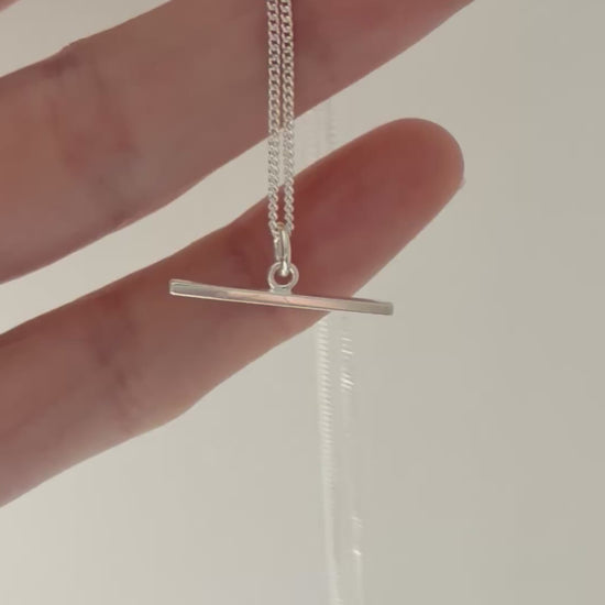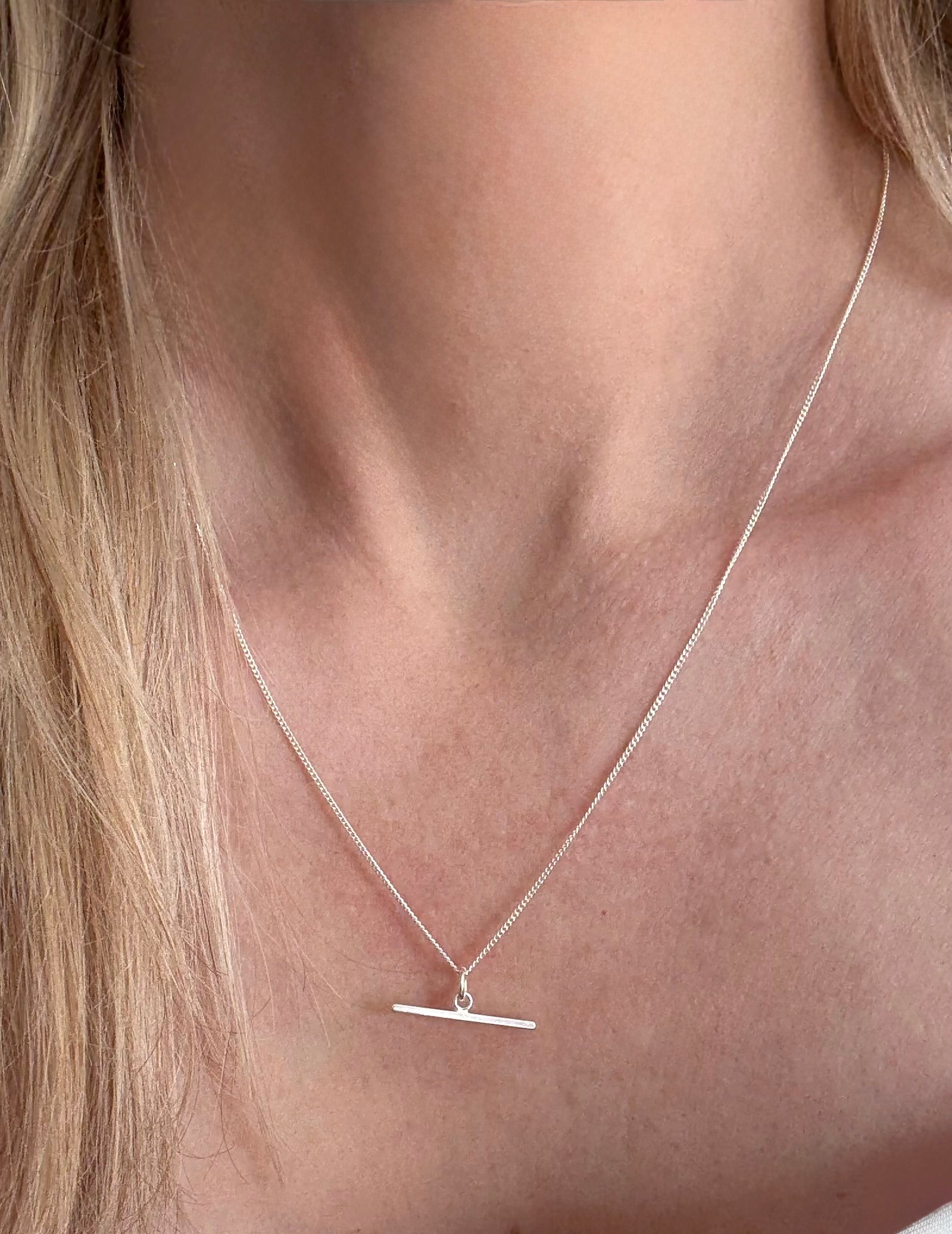 A delicate sterling silver t-bar necklace on a light curb chain with bolt ring closure.