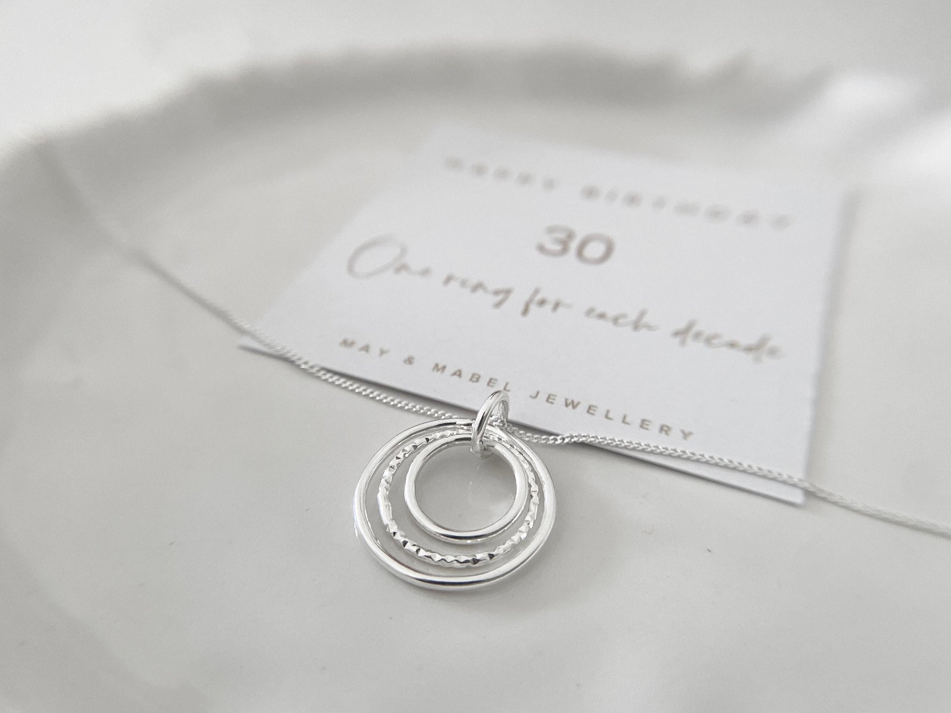 Celebrate a loved one’s big 30 with this dainty sterling silver 30th birthday necklace. The pendant has three silver rings for three decades to represent their milestone.