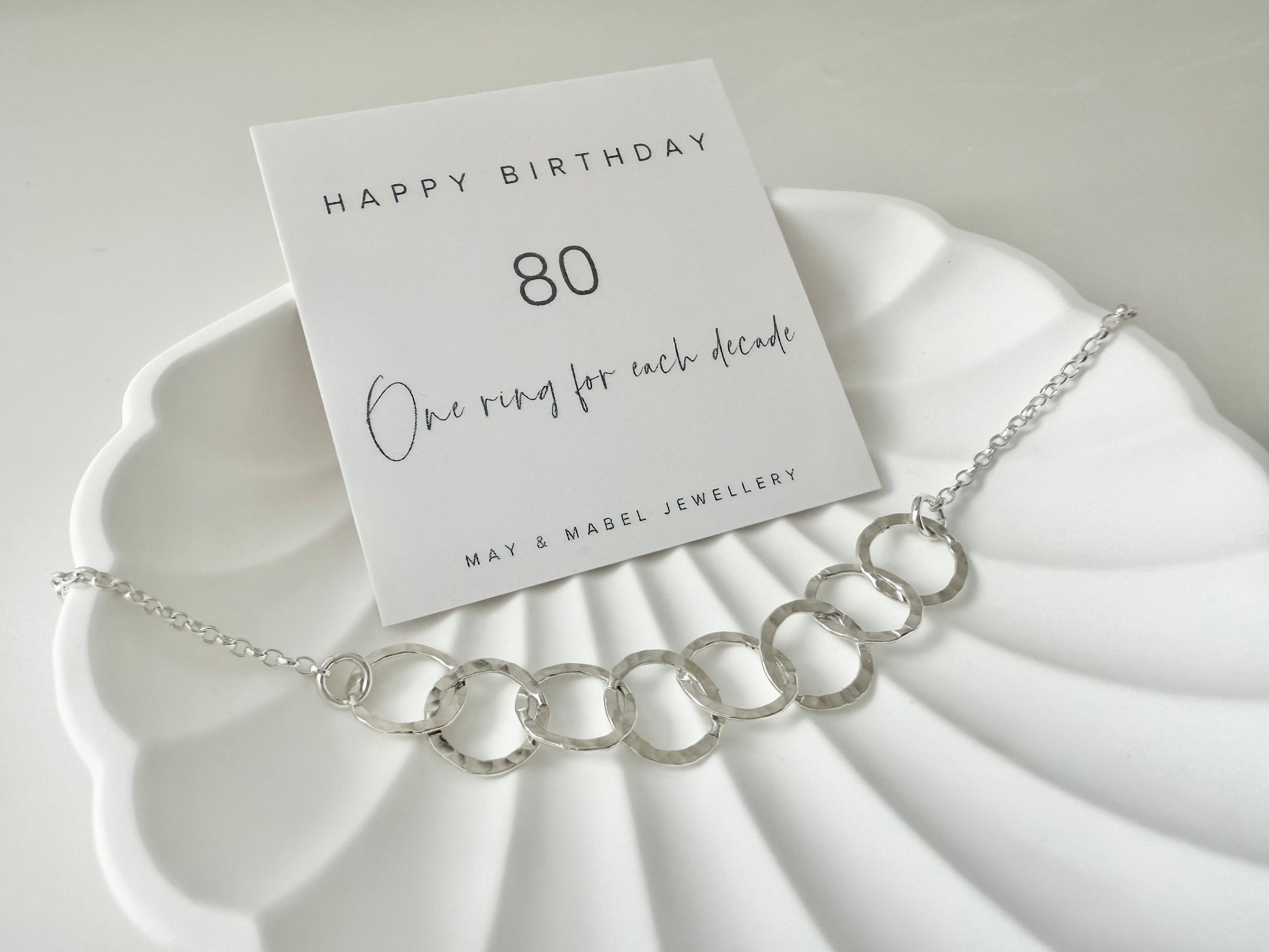 A beautiful 80th birthday gesture, this sterling silver eight ring necklace makes the perfect gift to celebrate a special eight decades milestone.