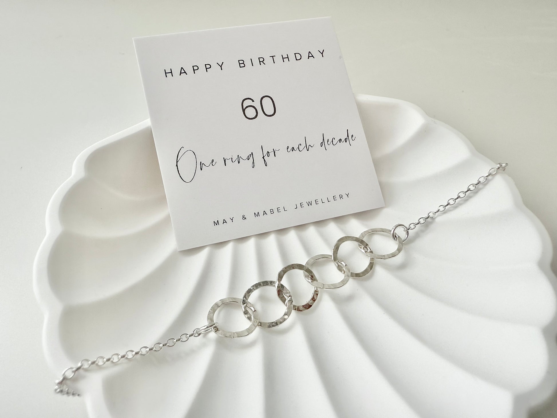 A beautiful 60th birthday gesture, this sterling silver six ring bracelet makes the perfect gift to celebrate a special six decades milestone.
