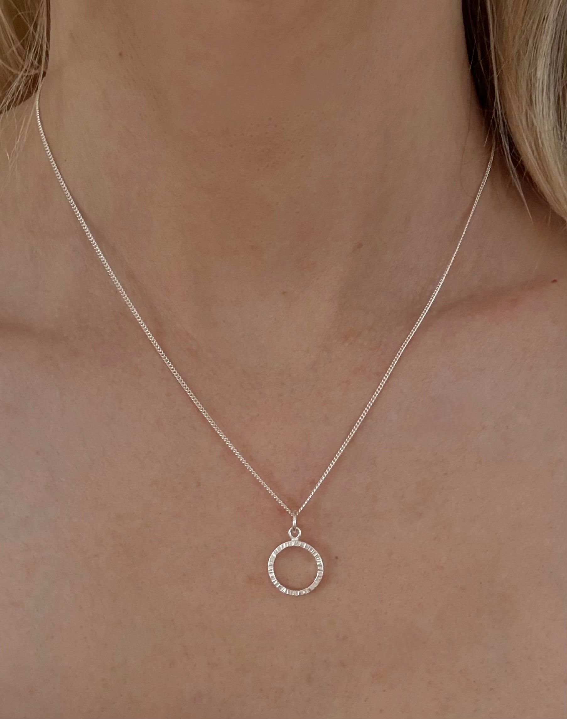 A delicate sterling silver line textured circle necklace on a light curb chain with bolt ring closure.