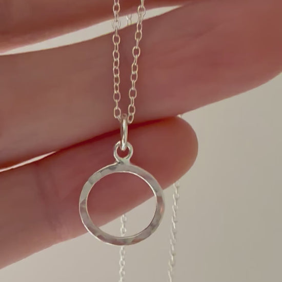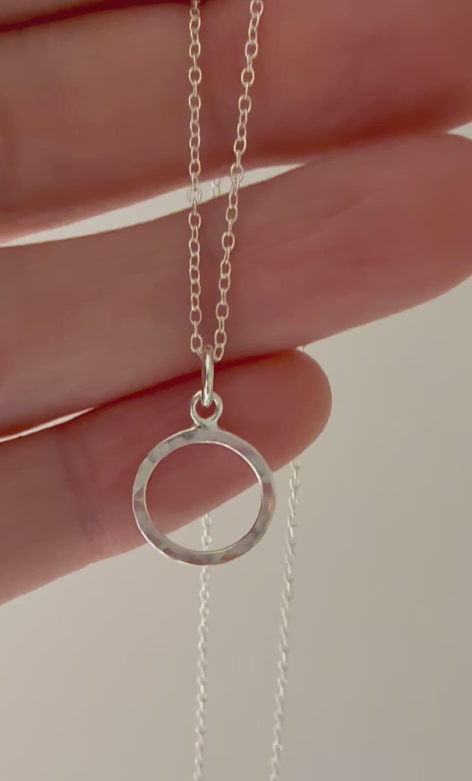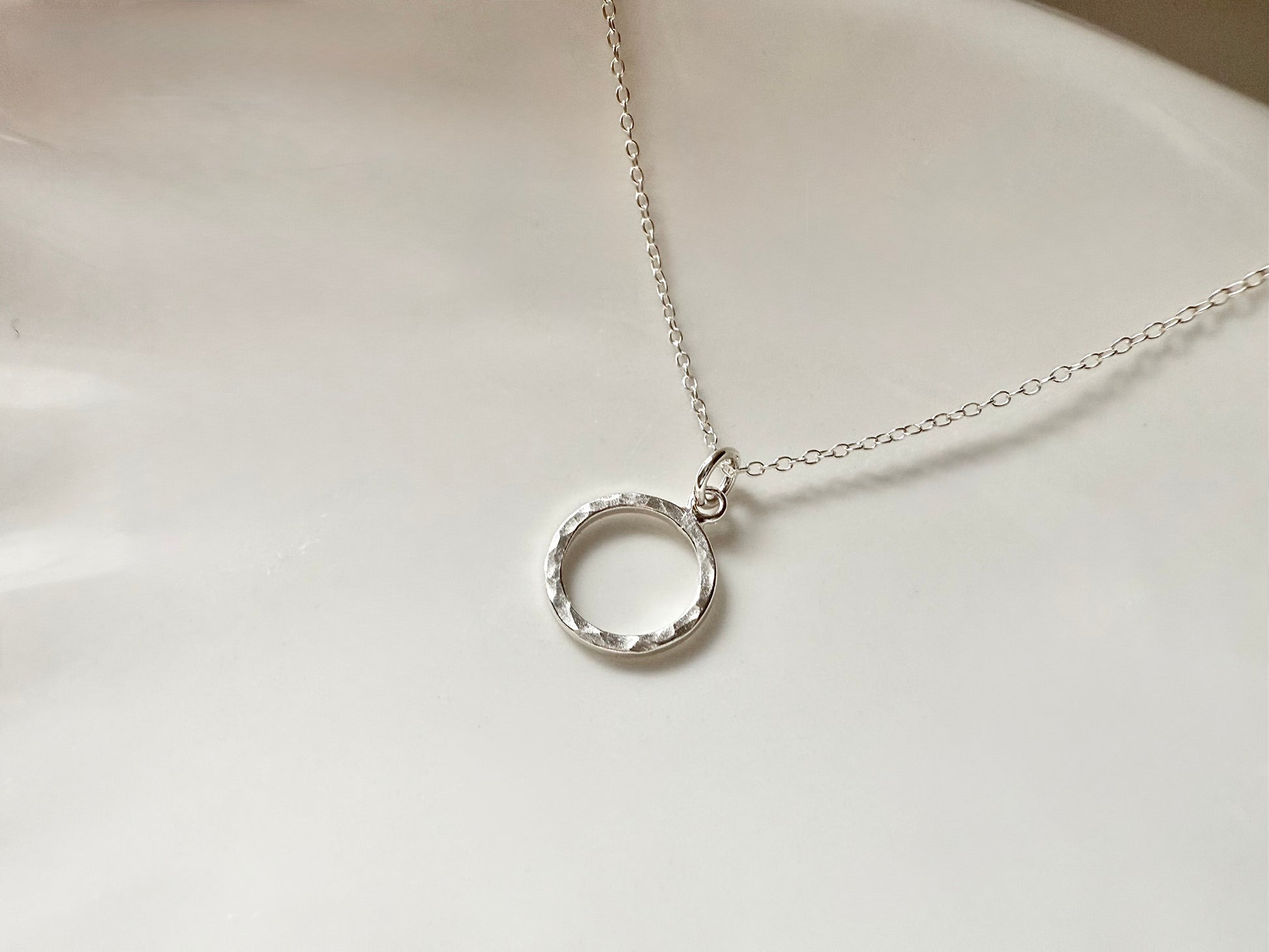 A delicate sterling silver hammer textured circle pendant on a light sterling silver trace chain with bolt ring closure.