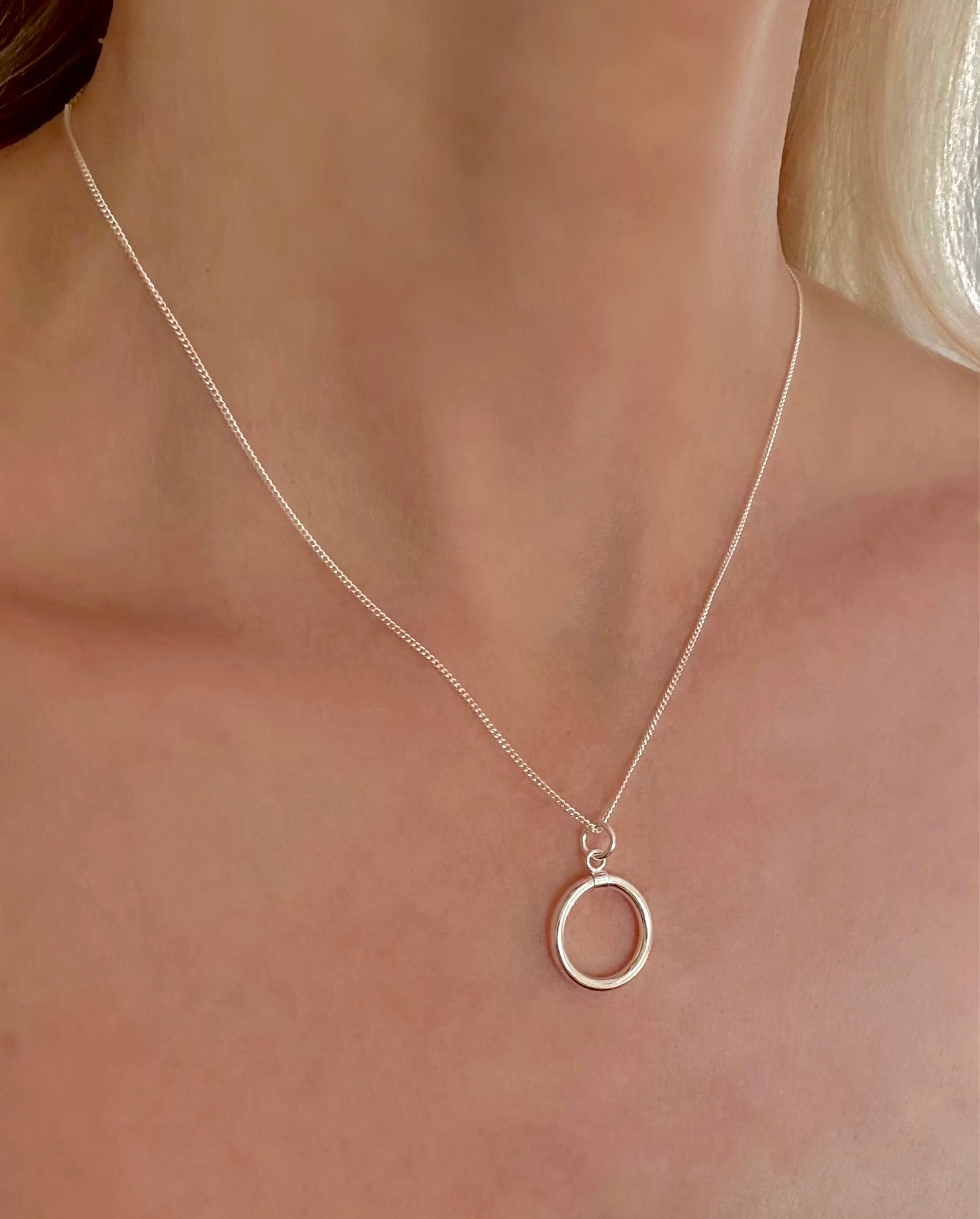 A light sterling silver pendant necklace on either a light curb or trace chain with bolt ring closure.