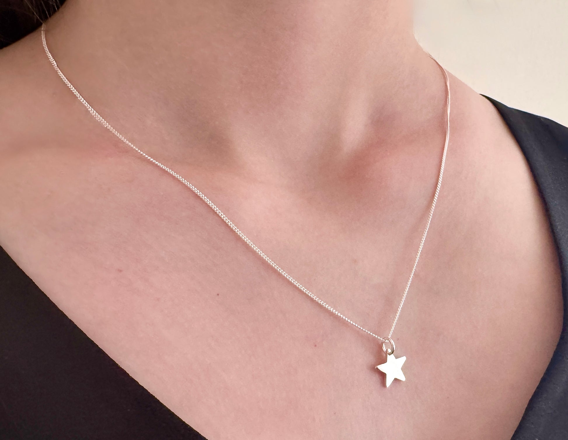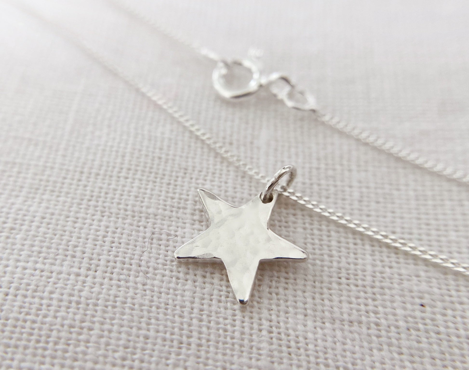 A petite sterling silver star necklace, with a pendant measuring 10mm (please note that the photographs are close up shots). The star pendant is available with either a hammered finish on one side or a smooth finish and is linked by a connecting ring to a sterling silver chain.