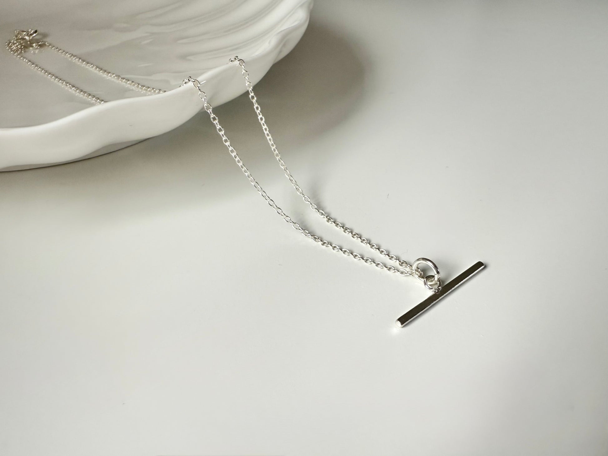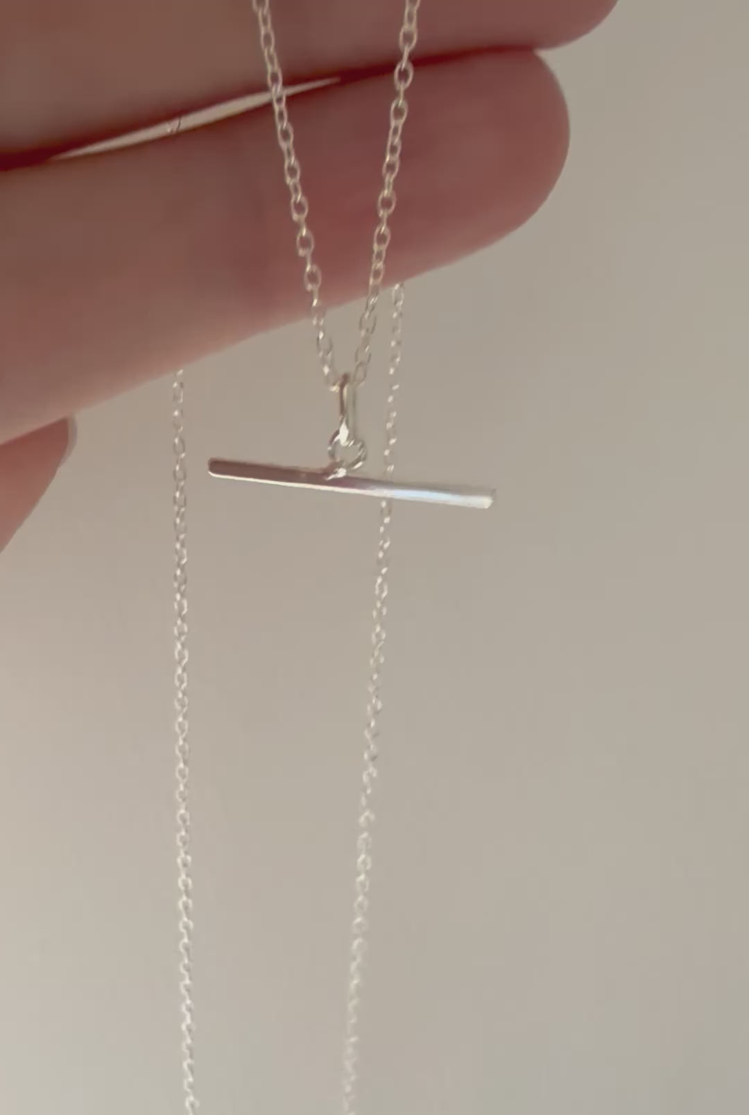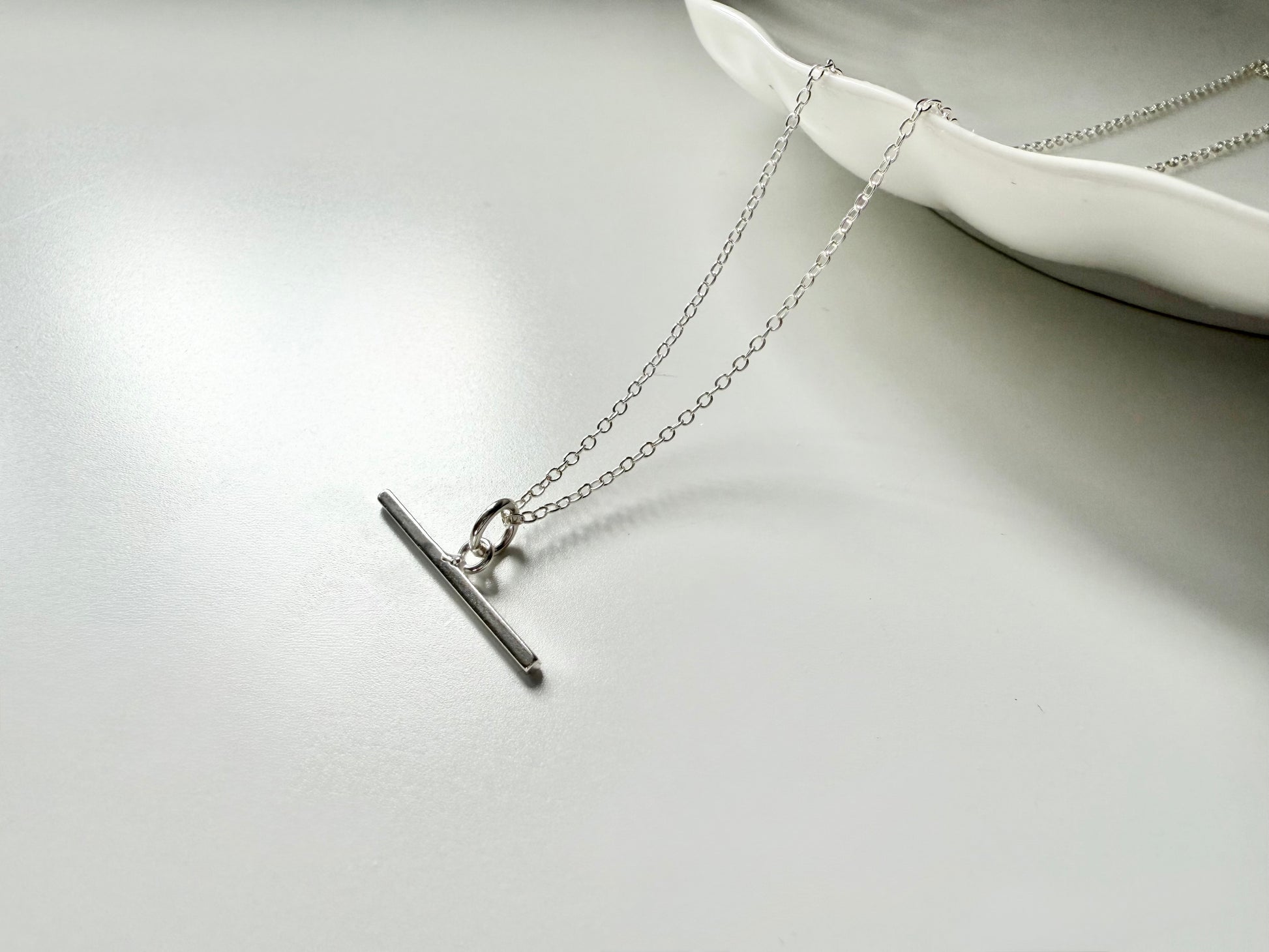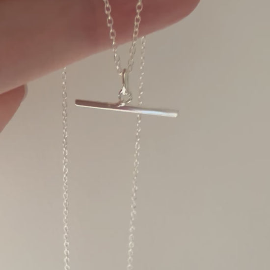 A delicate sterling silver t-bar necklace on a light trace chain with bolt ring closure.